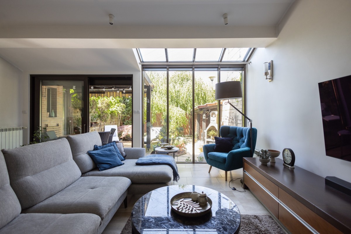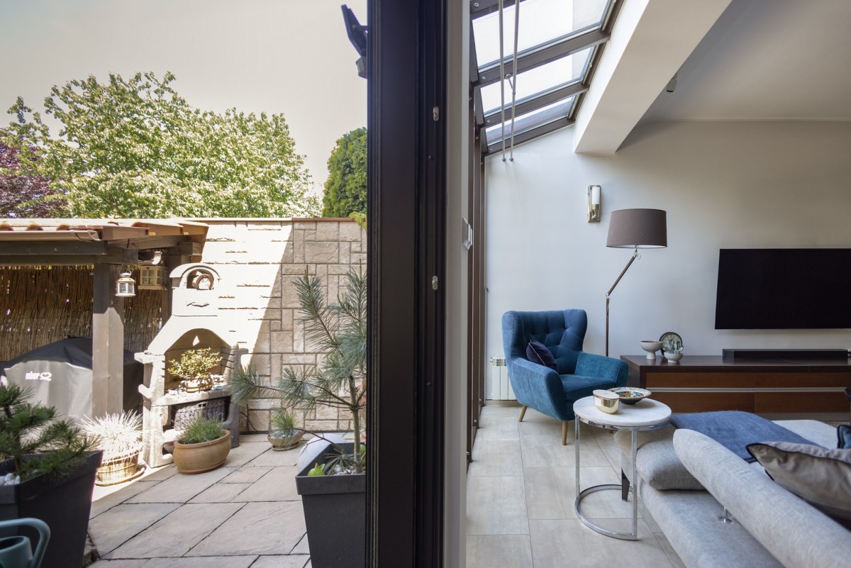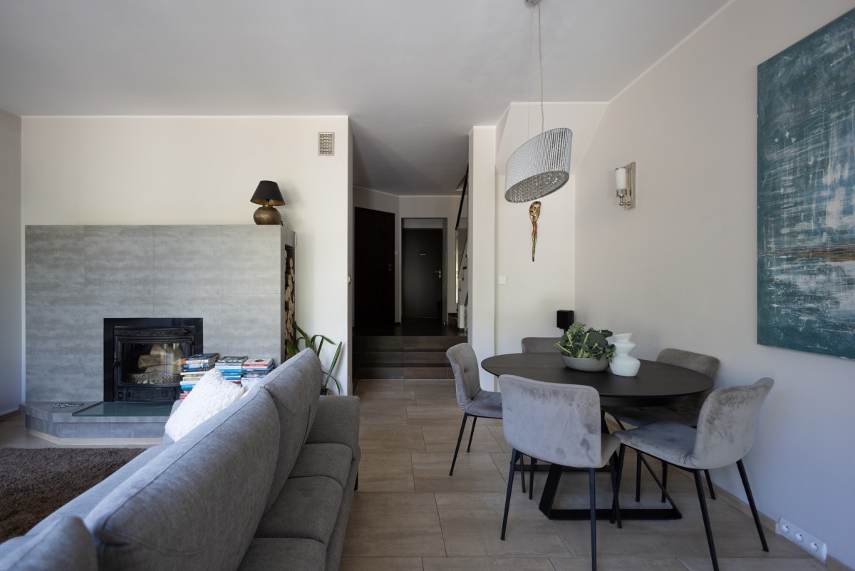 • Przestronny salon z dużymi przeszkleniami i wyjściem do ogródka