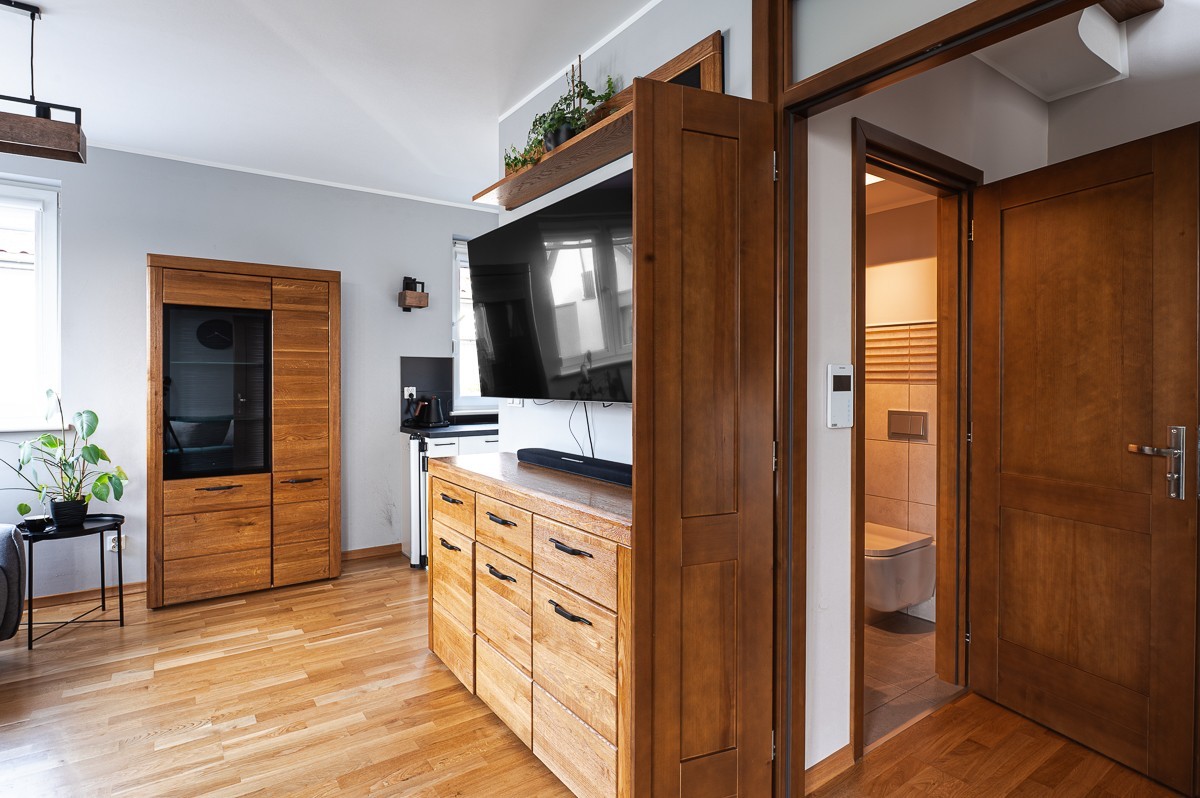 komoda, szafka i półka w salonie drewniane - dąb