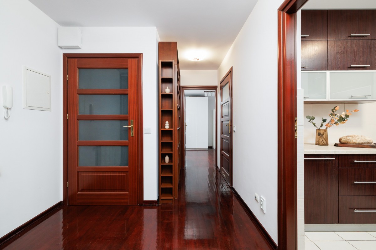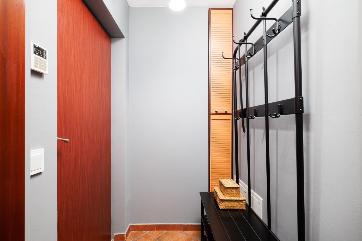 Wnętrze ma ciepły, przytulny klimat, a przemyślany układ pomieszczeń pozwala na wygodne oddzielenie strefy dziennej od prywatnej. Klimatowi wnętrzu nadają drewniane podłogi. Przestronny salon z wyjściem na taras tworzy naturalne centrum życia domowego, a duża sypialnia oferuje miejsce zarówno do wypoczynku, jak i zorganizowania komfortowego miejsca do pracy. W przedpokoju znajduje się pojemna zabudowana szafa, która zapewnia dużo przestrzeni do przechowywania oraz regał.