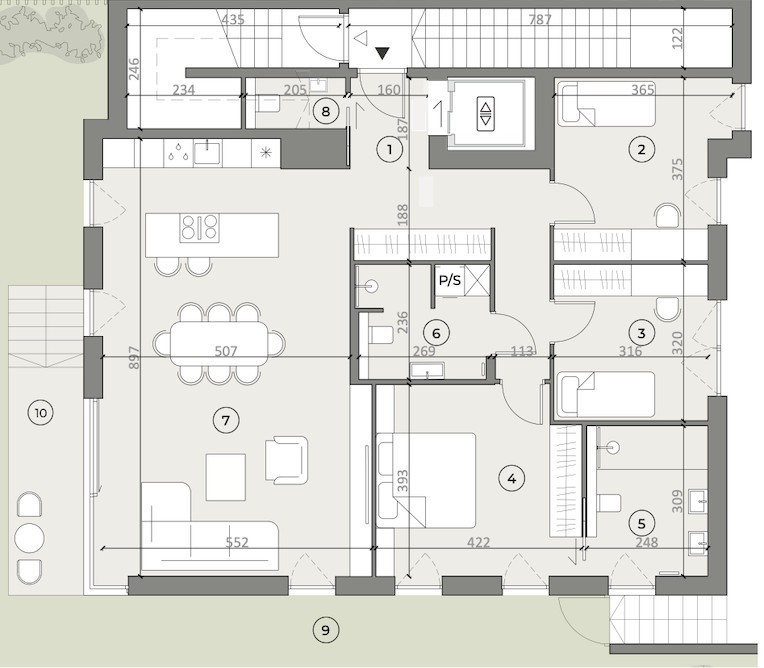 Prezentowany apartament M1 to wyjątkowy lokal położony na parterze inwestycji - z prywatnym ogrodem o powierzchni ponad 230 m², który tworzy kameralną strefę relaksu i otwiera wnętrze na zieleń.