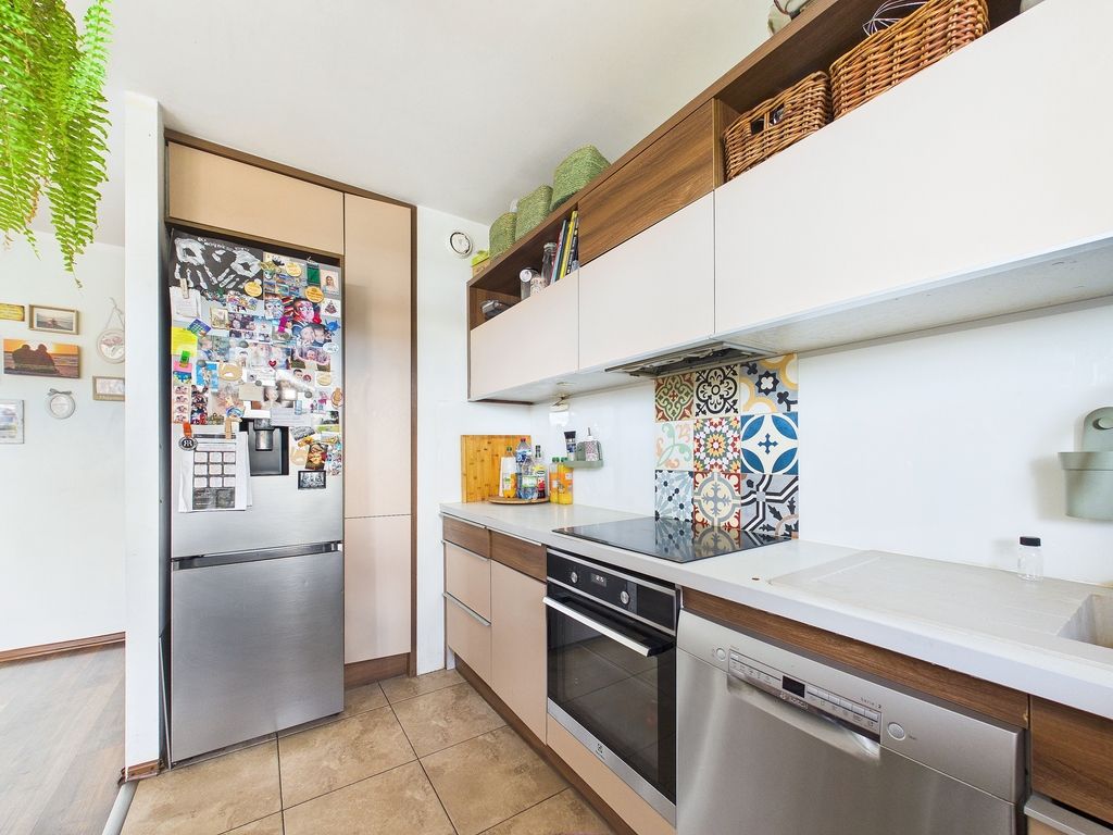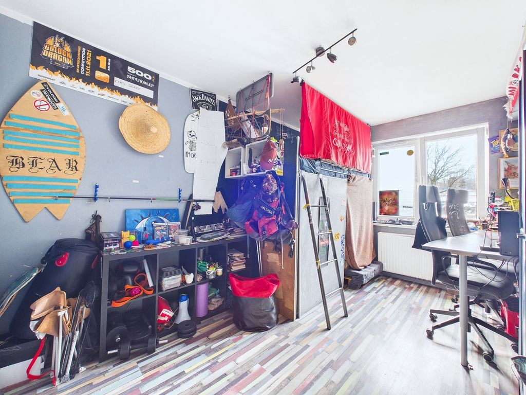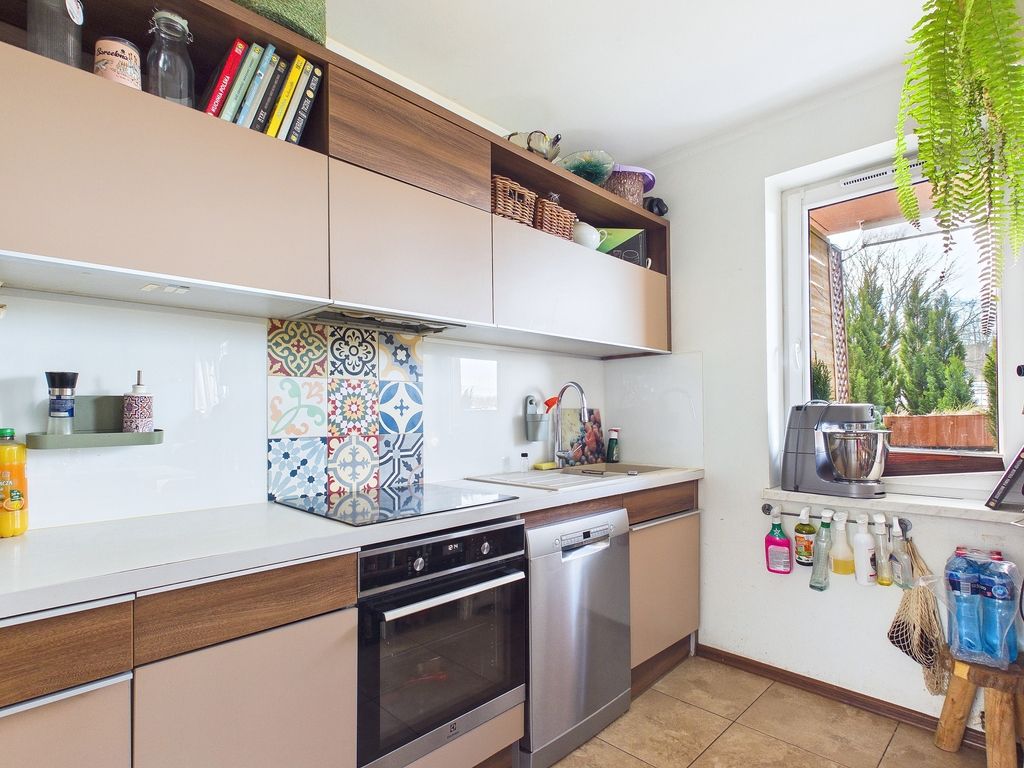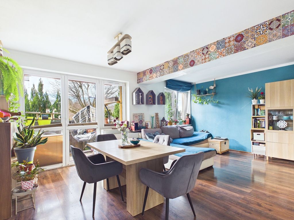 The apartment is located on the elevated ground floor in a housing estate built in 2013, the building is surrounded by low-rise buildings and the grounds of Fort Krzesławice.