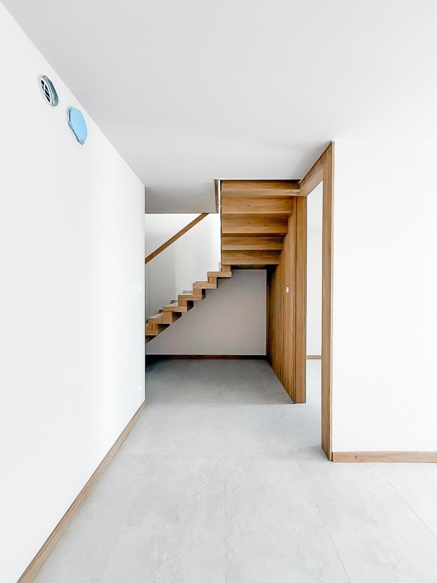 Mieszkanie usytuowane jest na trzecim piętrze nowoczesnego apartamentowca, a jego układ pozwala na elastyczne zagospodarowanie wnętrz. Na pierwszym poziomie znajdują się przestronne pomieszczenia, które można zaaranżować według własnych potrzeb. Antresola natomiast może pełnić funkcję domowego biura, strefy relaksu lub dodatkowej sypialni.
