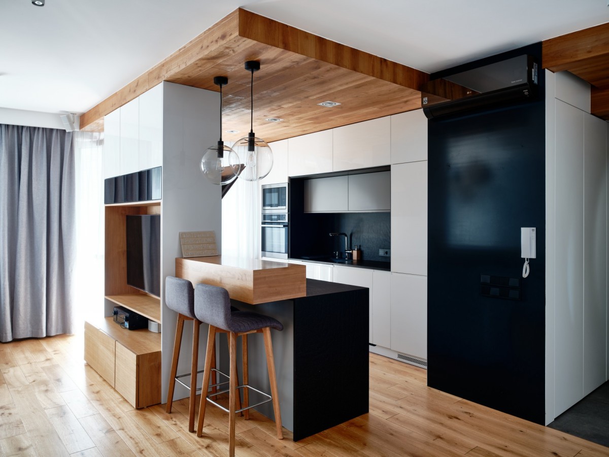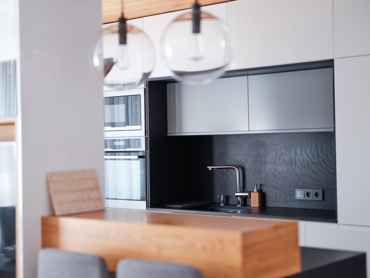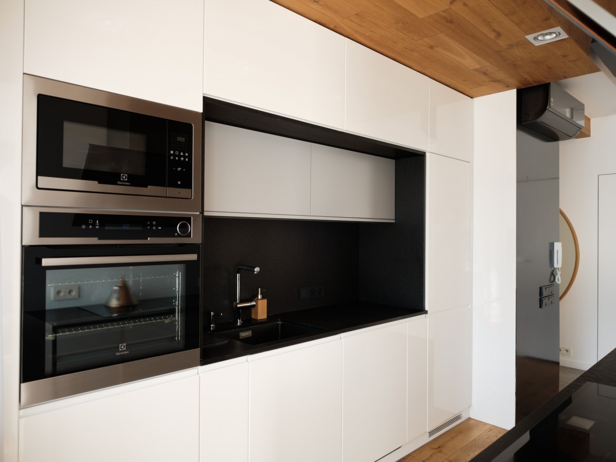 Kuchnia to połączenie nowoczesnego designu z funkcjonalnością - kamienne grafitowe blaty, fronty w bieli i szarości, liczne szafki i szuflady z systemem BLUM, pełne wyposażenie AGD oraz dekoracyjny sufit z parkietu (identycznego jak na podłodze w całym mieszkaniu).