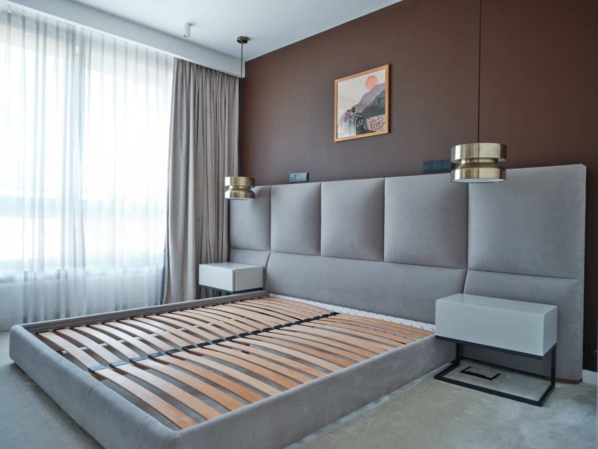 Sypialnia główna została zaprojektowana jako oaza spokoju - z pięknym tapicerowanym łóżkiem o szerokości 2 m, zabudowaną szafą, telewizorem, klimatycznym oświetleniem oraz automatycznymi zasłonami blackoutowymi. Komfort sypialni podnosi miękka, gruba wykładzina.