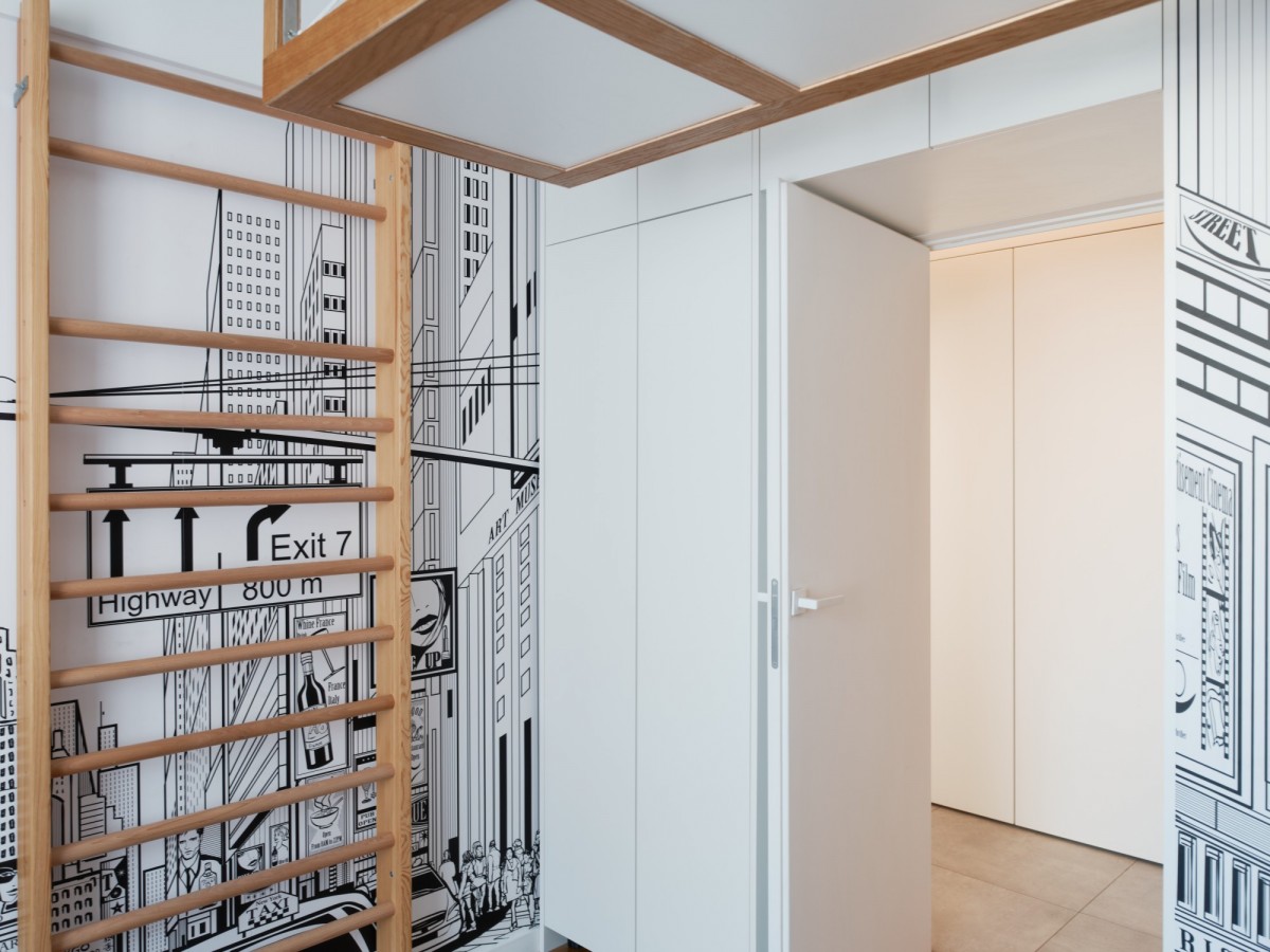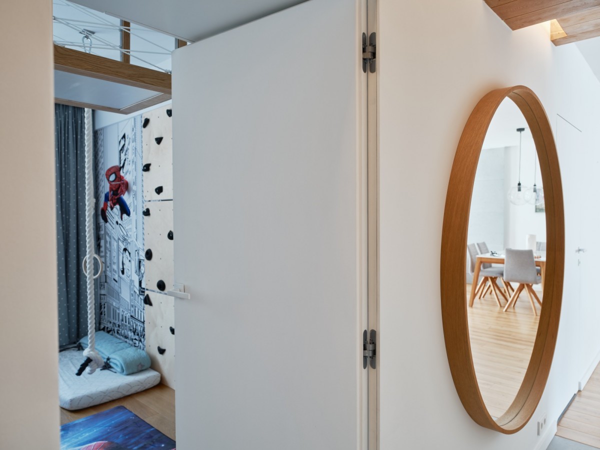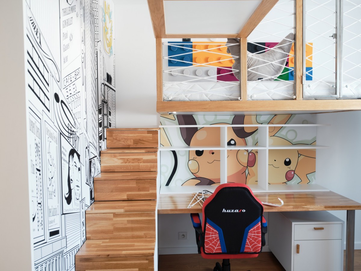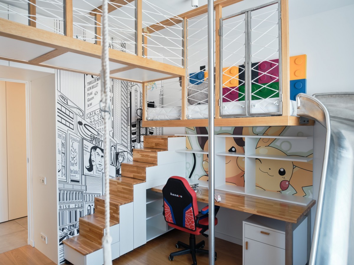 Sypialnia dziecięca to królestwo zabawy i nauki - z zabudową w formie labiryntu z drabinkami, linami, schodkami oraz zjeżdżalnią. Wbudowane piętrowe łóżko i biurko sprawiają, że pokój jest jednocześnie funkcjonalny i kreatywny. Ten wyjątkowy pokój będzie spełnieniem marzeniem każdego dziecka.