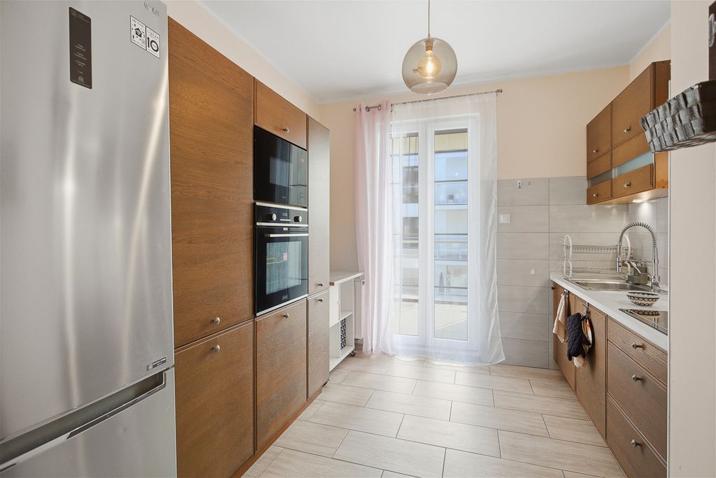 W skład mieszkania wchodzą trzy pokoje, widna kuchnia z pełnym wyposażeniem (meble w zabudowie, lodówka, zmywarka, okap, piekarnik, mikrofalówka, płyta grzewcza elektryczna, zlewozmywak, zamrażarka), łazienka z wanną, umywalką, WC i grzejnikiem drabinkowym oraz garderoba. Podłogi wyłożone są panelami, co zapewnia przytulny klimat.