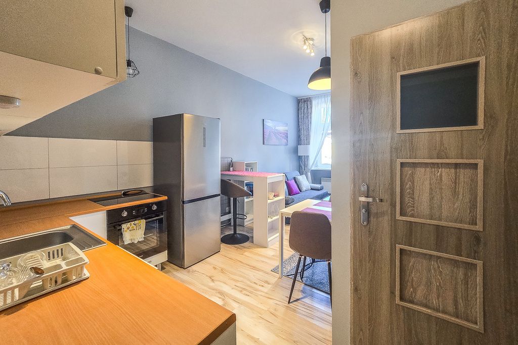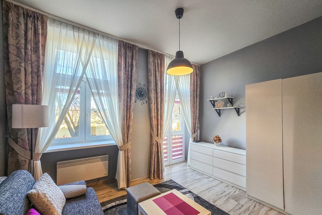 To rozkładowe mieszkanie usytuowane na 1. piętrze w 3-piętrowym budynku z cegły z 1930 roku. Mieszkanie jest w bardzo dobrym stanie, po remoncie, co oznacza, że można się wprowadzać od razu. Zostało zaprojektowane i urządzone na dwie osobne kawalerki o powierzchniach 22 m² i 20 m². Każda z nich posiada osobne wejście z korytarza, aneks kuchenny oraz własną łazienkę. Okna wychodzą na wschód, co zapewnia dużo naturalnego światła. W jednej jest również balkon. Obie znajdują się na jednej KW jako mieszkanie o pow. 42,48 m².