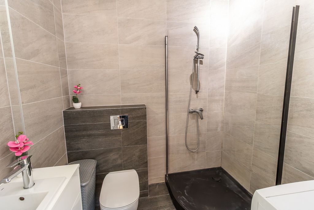 Aneks kuchenny wyposażony jest w meble w zabudowie oraz sprzęty AGD: lodówkę,, zmywarkę i okap. Łazienka z WC posiada prysznic, umywalkę, pralkę oraz grzejnik drabinkowy.