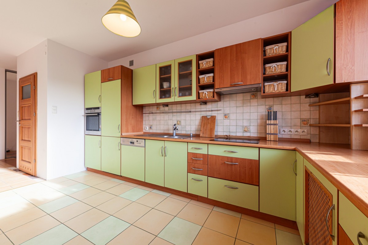 Kuchnia pozostaje w pełni wyposażona w zabudowę z kompletnym sprzętem AGD, dzięki czemu od razu możesz zacząć z niej korzystać. Jej funkcjonalność doceni zarówno miłośnik gotowania, jak i ktoś, kto preferuje szybkie, codzienne posiłki.