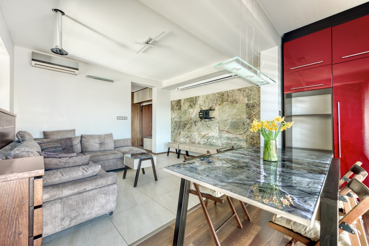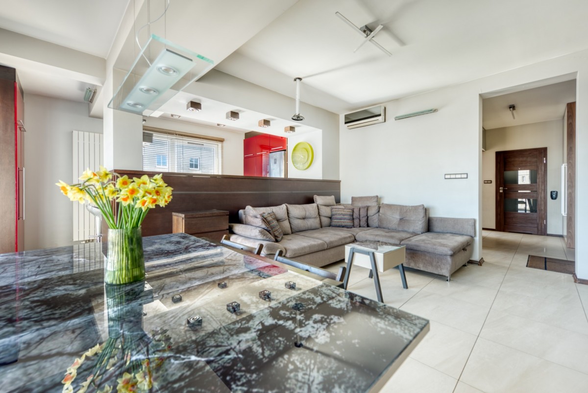- Salon - przestronny, bardzo dobrze doświetlony, stanowiący centralną część mieszkania. Wnętrze utrzymane w spójnej stylistyce, z wyraźnie wydzieloną strefą relaksu (duża narożna sofa) oraz częścią jadalnianą z pełnowymiarowym stołem. Całość uzupełnia przemyślane oświetlenie sufitowe oraz klimatyzacja zapewniająca komfort w okresie letnim.