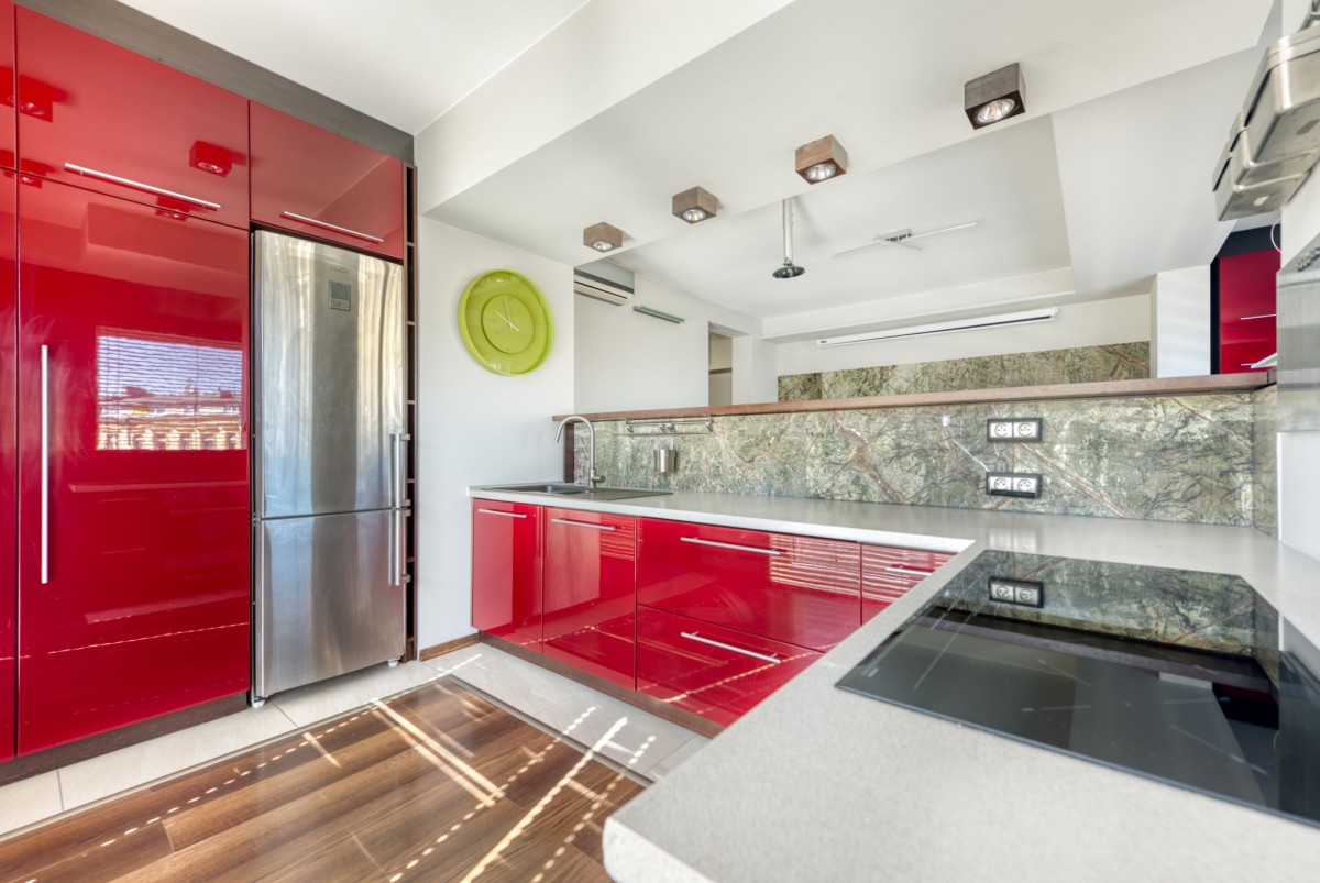 - Kuchnia - funkcjonalna, otwarta na salon, a jednocześnie czytelnie wydzielona zabudową oraz blatem barowym. Układ w kształcie litery „U” zapewnia bardzo dobrą ergonomię pracy oraz dużą ilość powierzchni roboczej. Kuchnia wyposażona jest w stałą zabudowę, oświetlenie punktowe oraz sprzęty AGD: płytę indukcyjną, piekarnik, zmywarkę oraz lodówko-zamrażarkę.