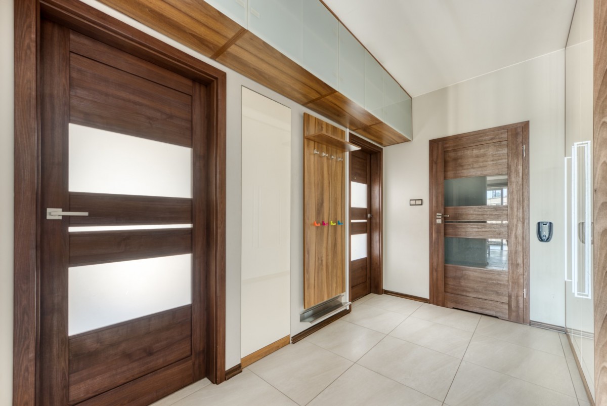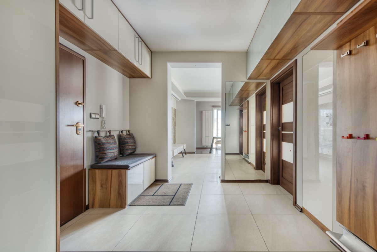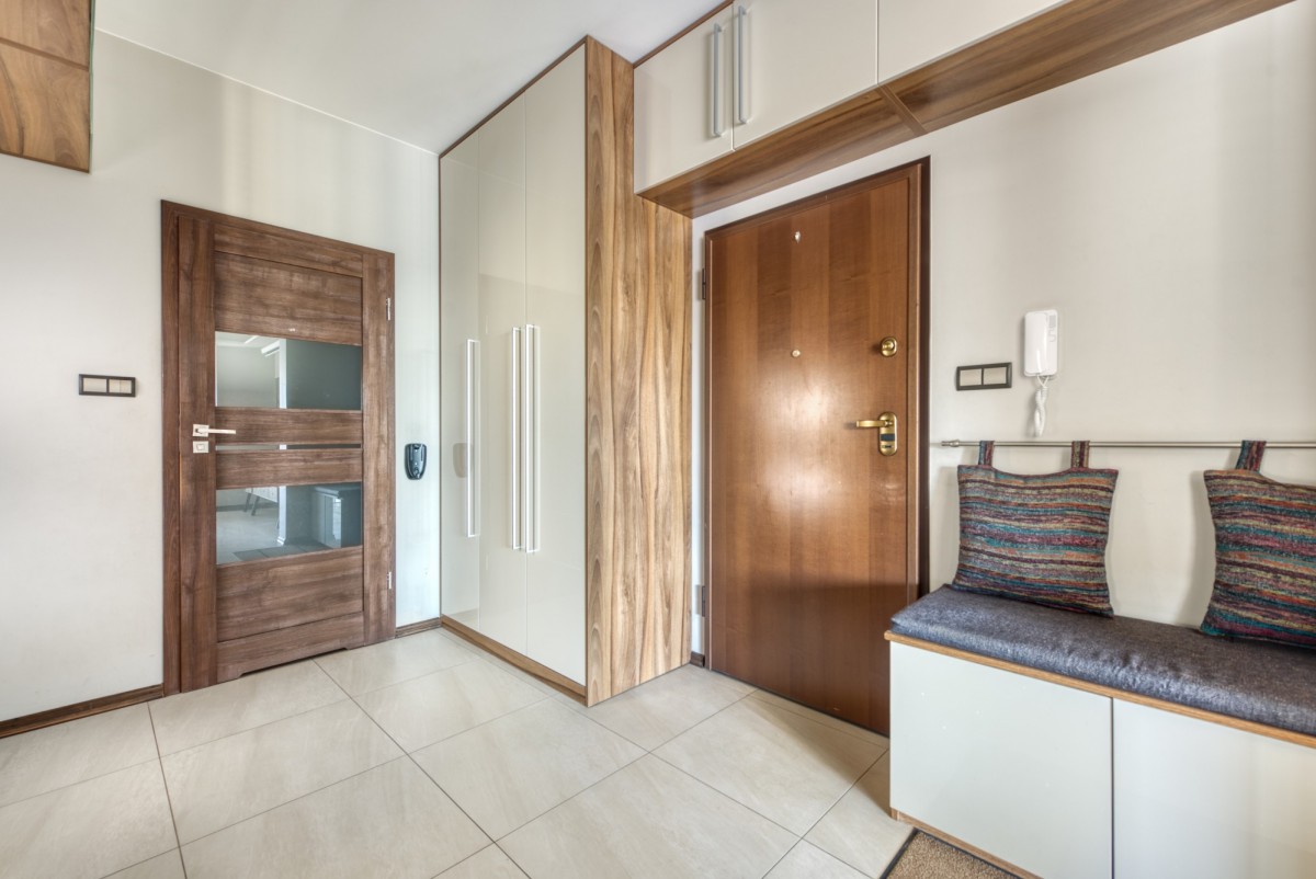 - Przedpokój - przestronny, z dobrze zaprojektowaną strefą wejściową i zabudową na wymiar, zapewniającą dużą ilość miejsca do przechowywania.