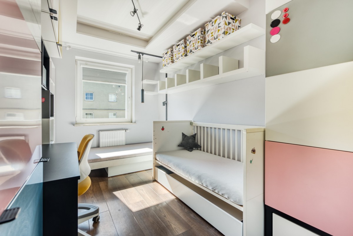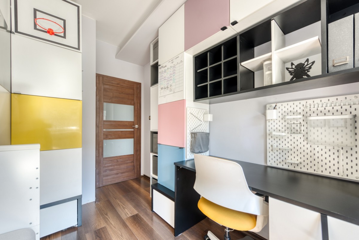 - Pokój - zaprojektowany jako funkcjonalna przestrzeń dla dziecka, z wyraźnym podziałem na strefę snu, nauki i przechowywania. Układ oraz zastosowana zabudowa umożliwiają łatwą zmianę funkcji pomieszczenia, np. na gabinet do pracy.