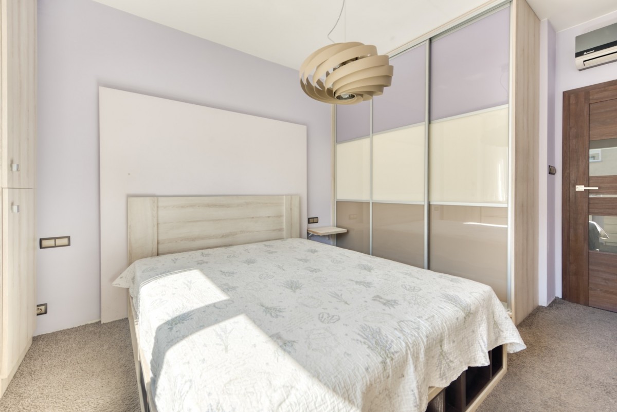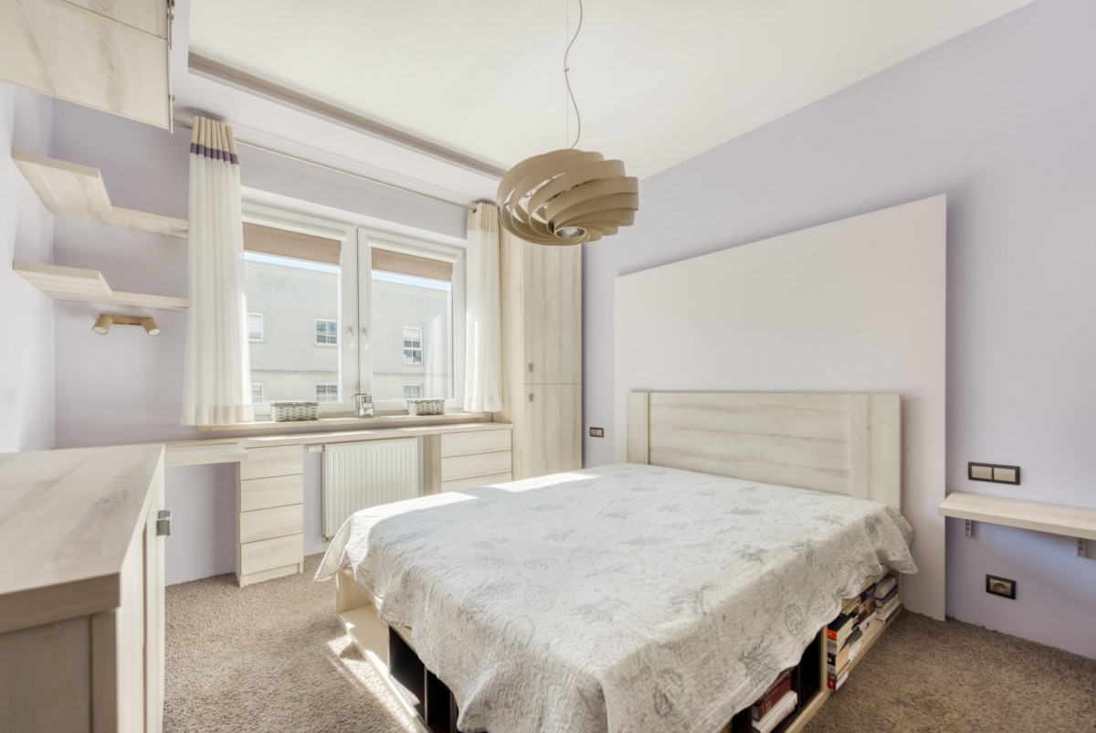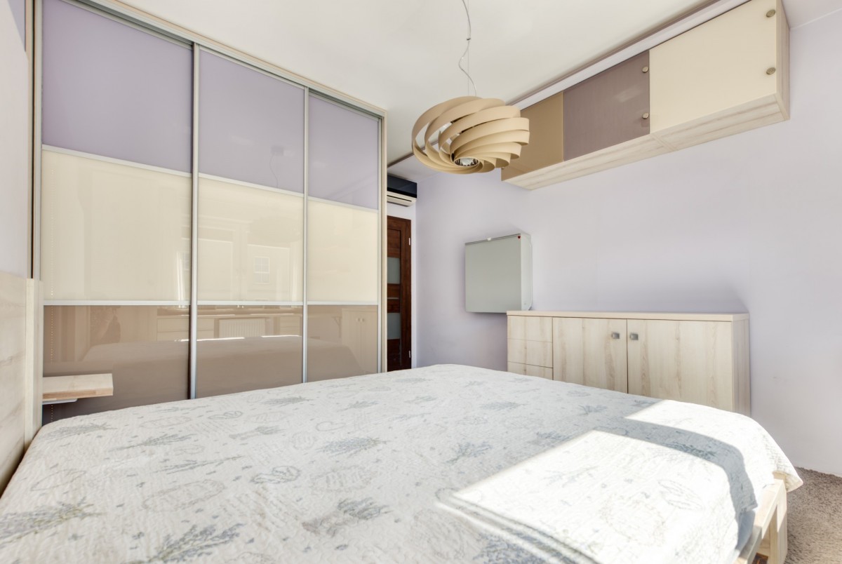 - Sypialnia - z zabudową meblową wykonaną na wymiar: pojemna szafa z przesuwnymi frontami oraz dodatkowe szafki i blat przy oknie. Wyposażona w łóżko małżeńskie.