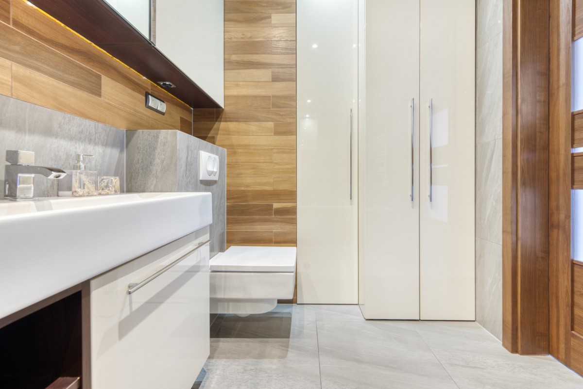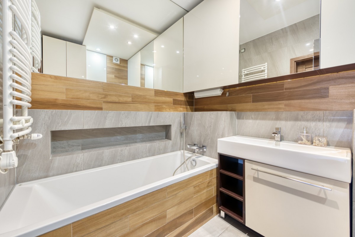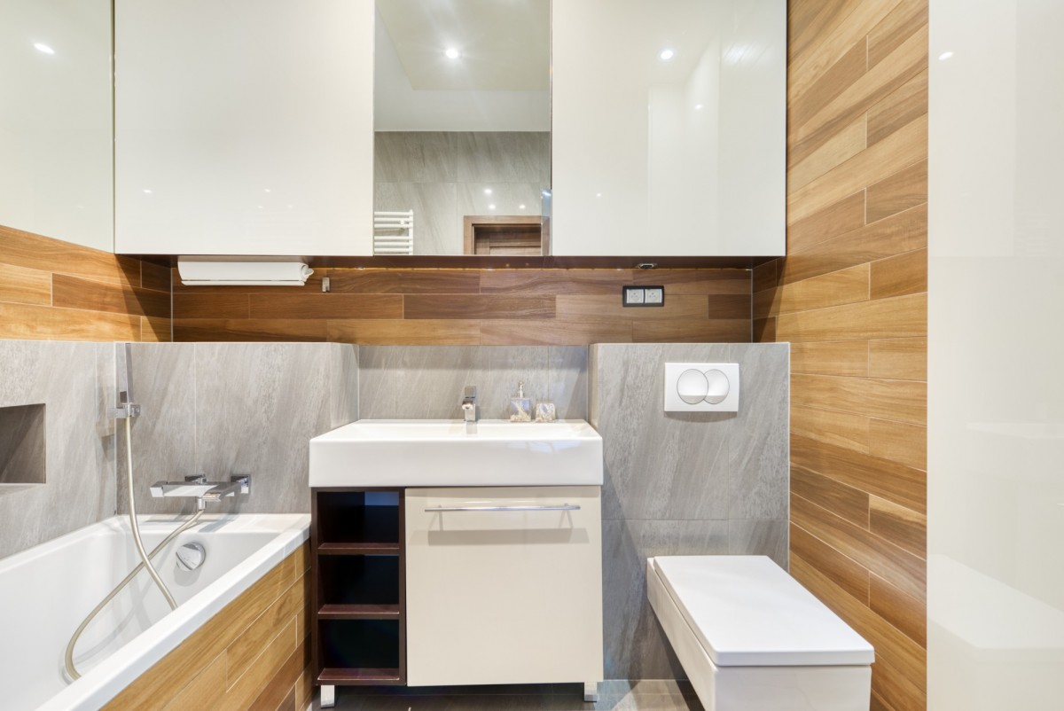 - Łazienka z WC - wyposażona w wannę oraz praktyczną wnękę na kosmetyki; szeroką umywalkę, lustro i sedes. Dodatkowym atutem jest zabudowa na wymiar, pozwalająca na estetyczne ukrycie funkcji gospodarczych.