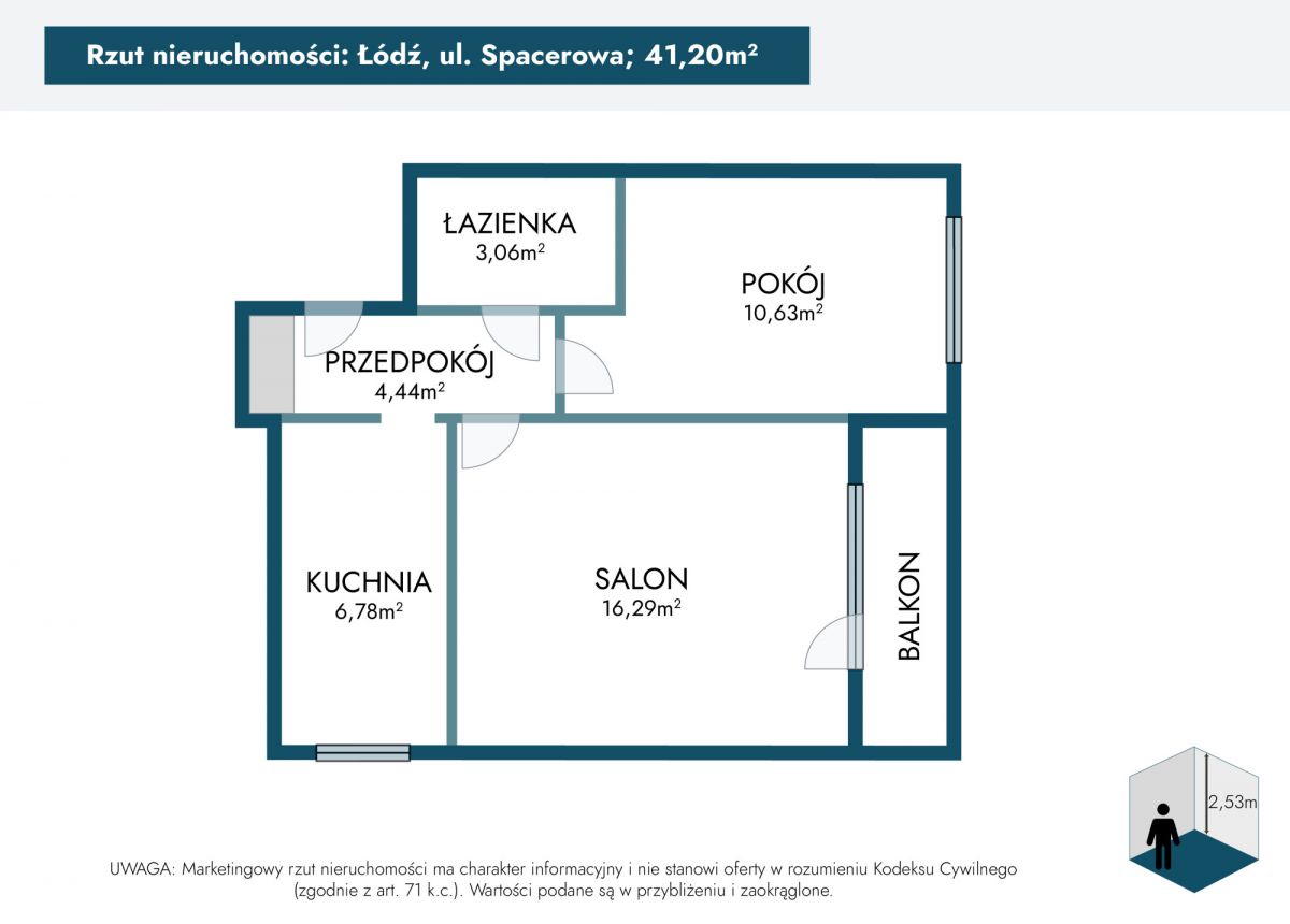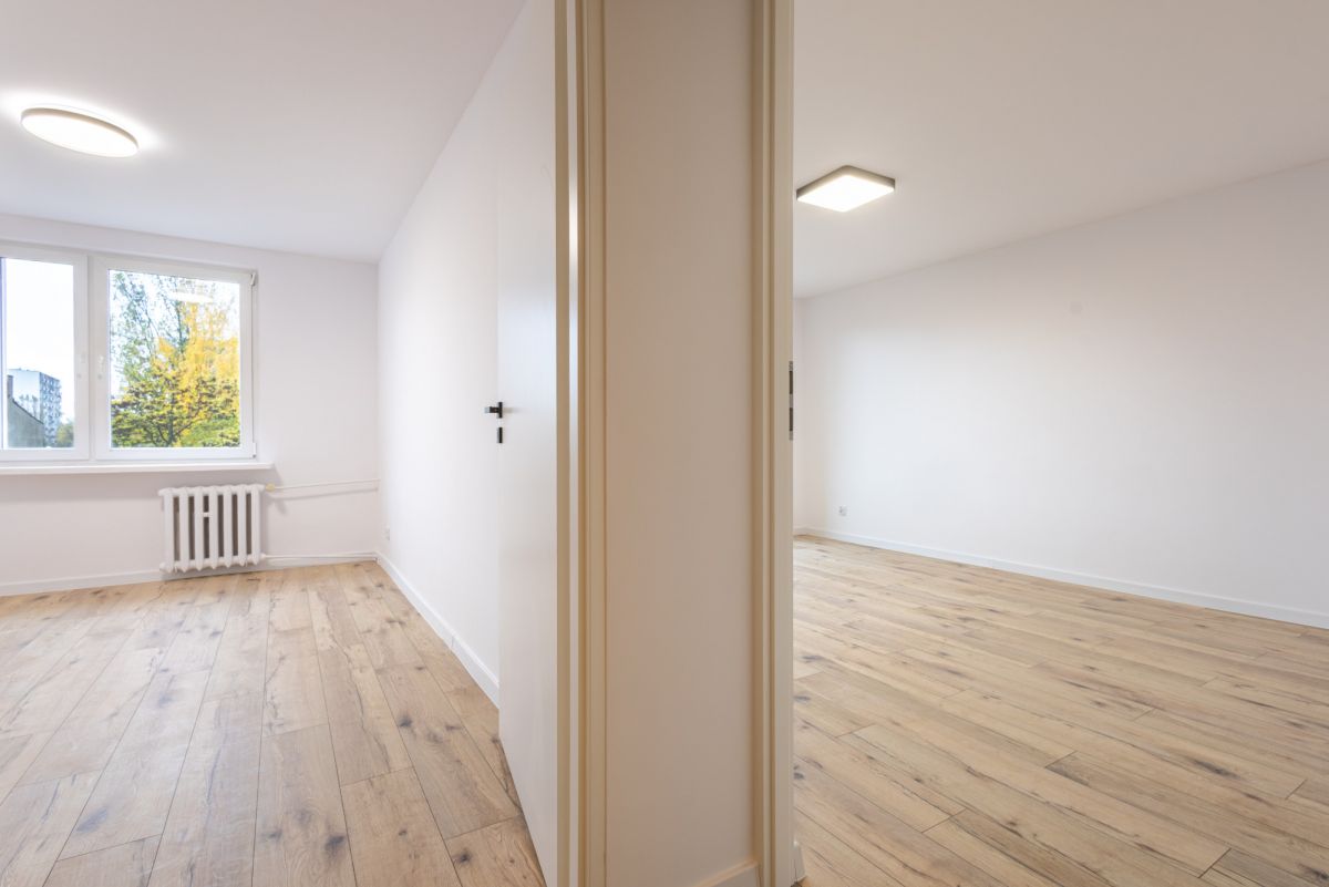 Widne i jasne, świeżo wyremontowane wnętrze (41,20 m²) zachowuje proporcje mieszkania o większych możliwościach niż wskazuje metraż, a ustawne pokoje dają możliwość realizacji wymarzonych aranżacji pod różne potrzeby. Salon (16,29 m²) jest naturalnym centrum: miejscem do pracy, przyjmowania gości i odpoczynku. Drugi pokój (10,63 m²) może być gabinetem, pokojem dziecięcym lub sypialnią. Kuchnia z oknem (6,78 m²) oferuje ergonomię i przestrzeń do gotowania. Nowoczesna łazienka (3,06 m²) z prysznicem, przedpokój (4,44 m²), balkon oraz komórka lokatorska dopełniają obraz.