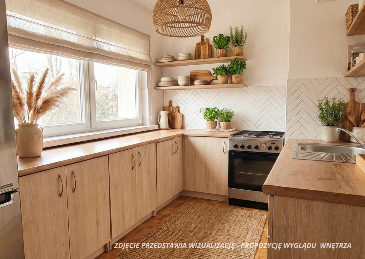 * widnej kuchni (5,4m² ) wyposażonej w zabudowę oraz lodówkę i piekarnik