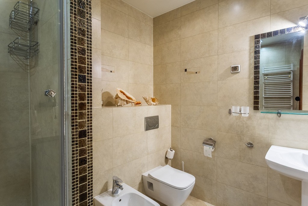 W łazience: wanna, prysznic, wc, bidet, pralka oraz grzejnik drabinkowy