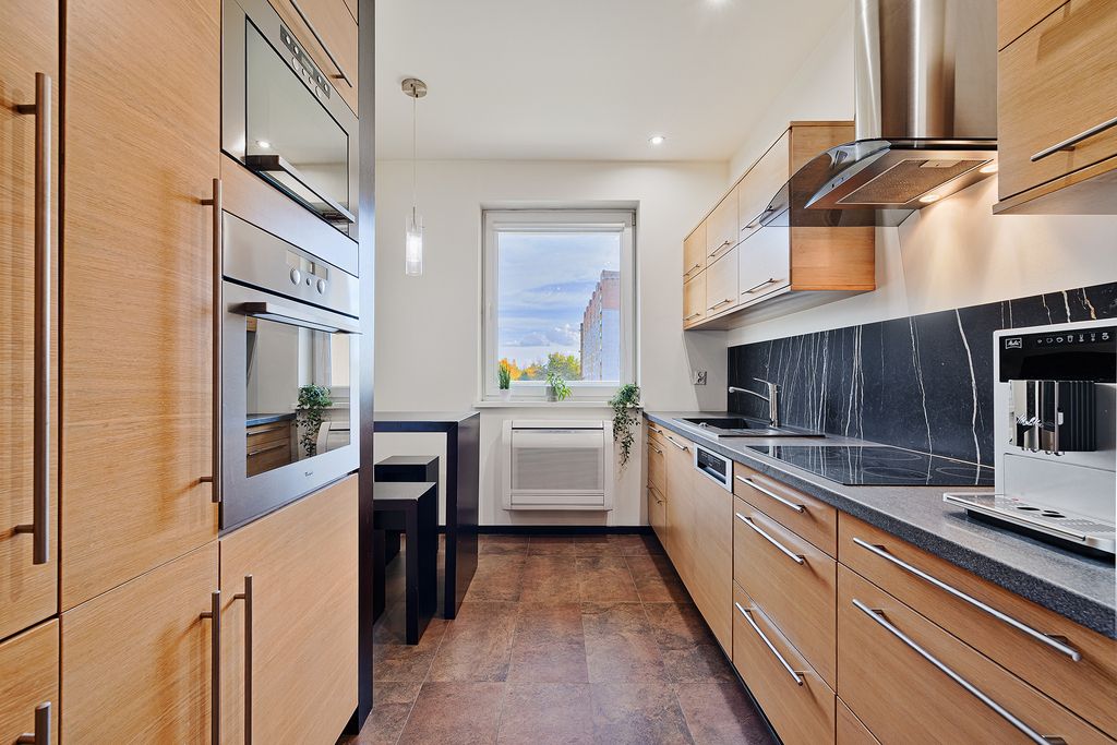 Mieszkanie składa się z dwóch niezależnych pokoi – salonu z wyjściem na balkon oraz sypialni. Kuchnia jest oddzielna i w pełni wyposażona w sprzęt AGD: lodówkę, zmywarkę, mikrofalówkę oraz piekarnik. Lokal jest klimatyzowany. Do mieszkania przynależy miejsce postojowe w garażu podziemnym – dodatkowo płatne 40 000 zł.