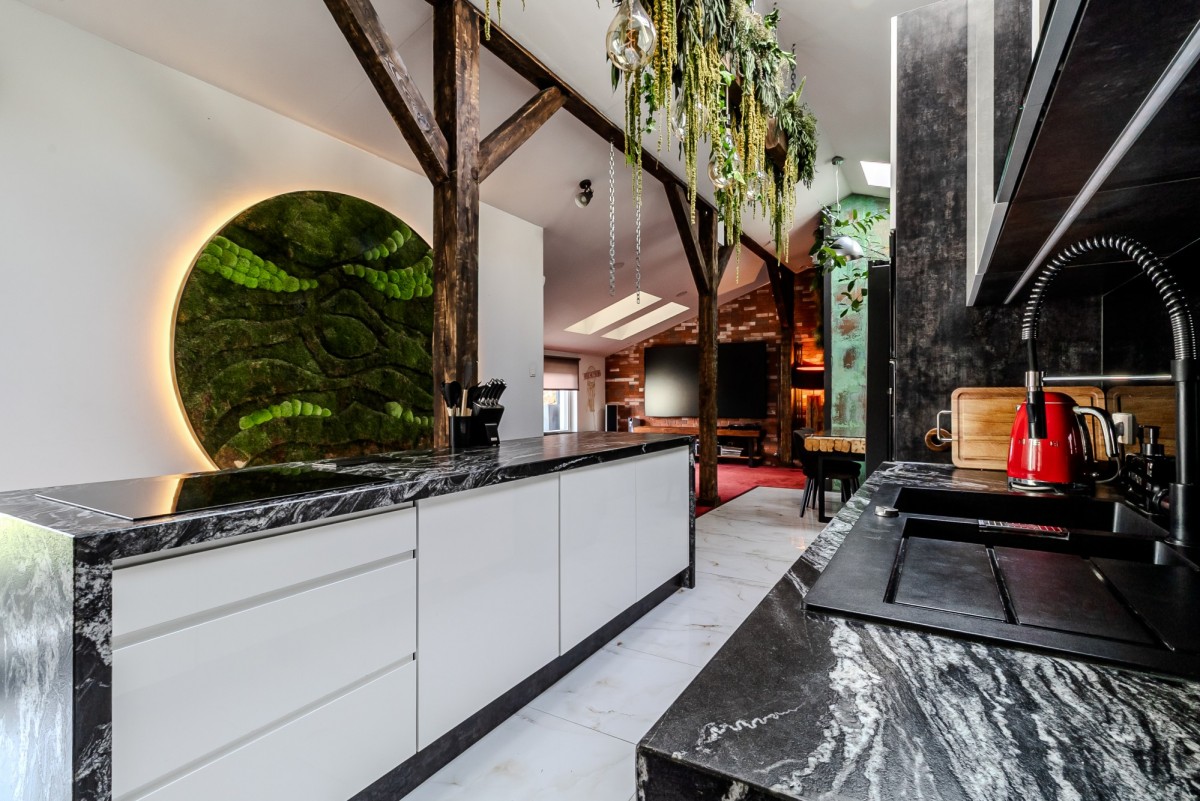 otwartą kuchnię z wyspą wykończoną w czarnym marmurze,