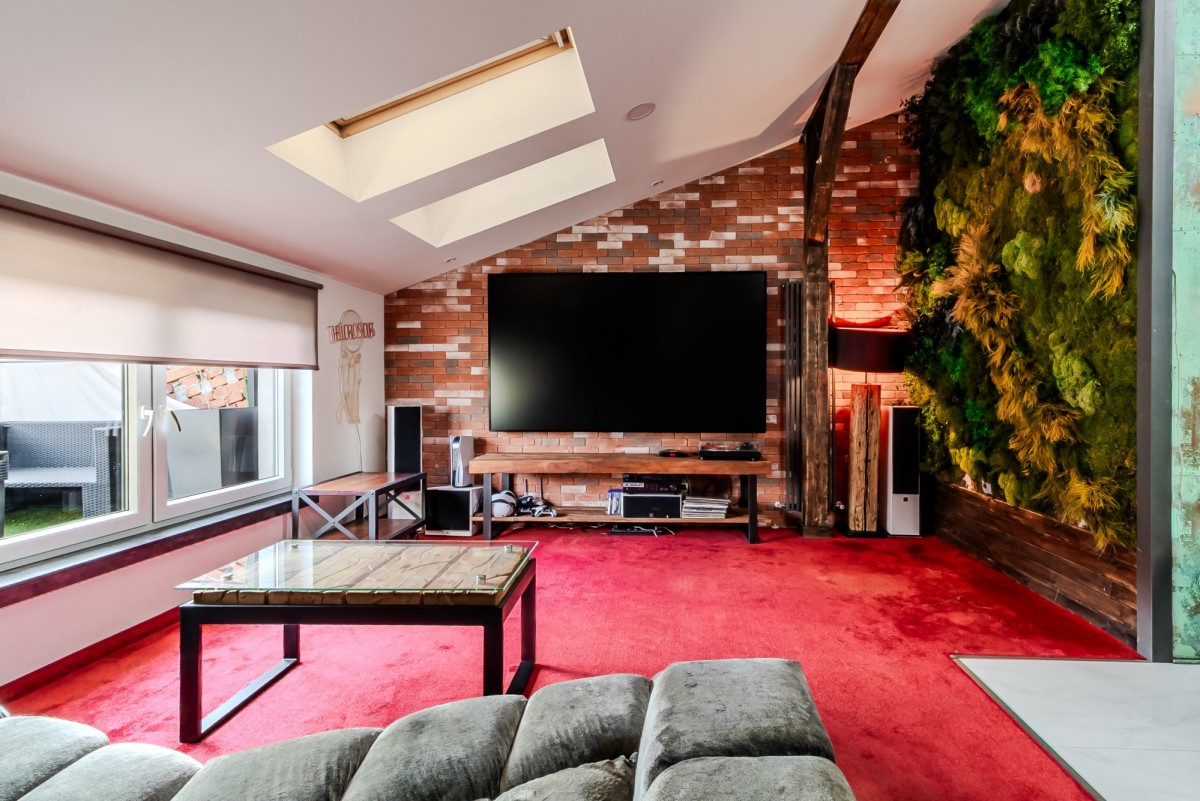 salon z dużym ekranem i widokiem na zabytkowe cegły dawnej przędzalni,