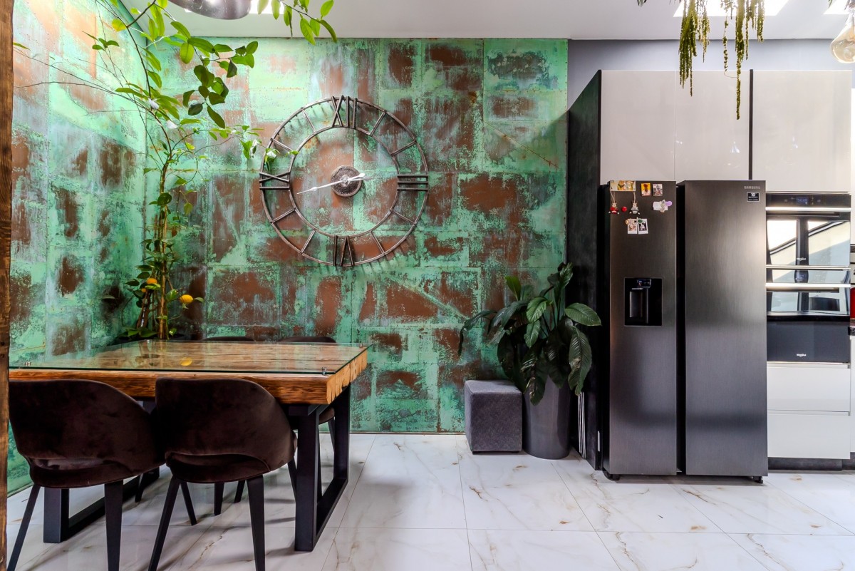 jadalnię z artystyczną ścianą w kolorze miedzi i zieleni,