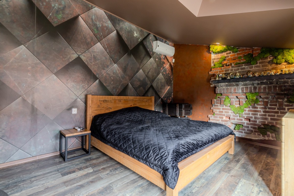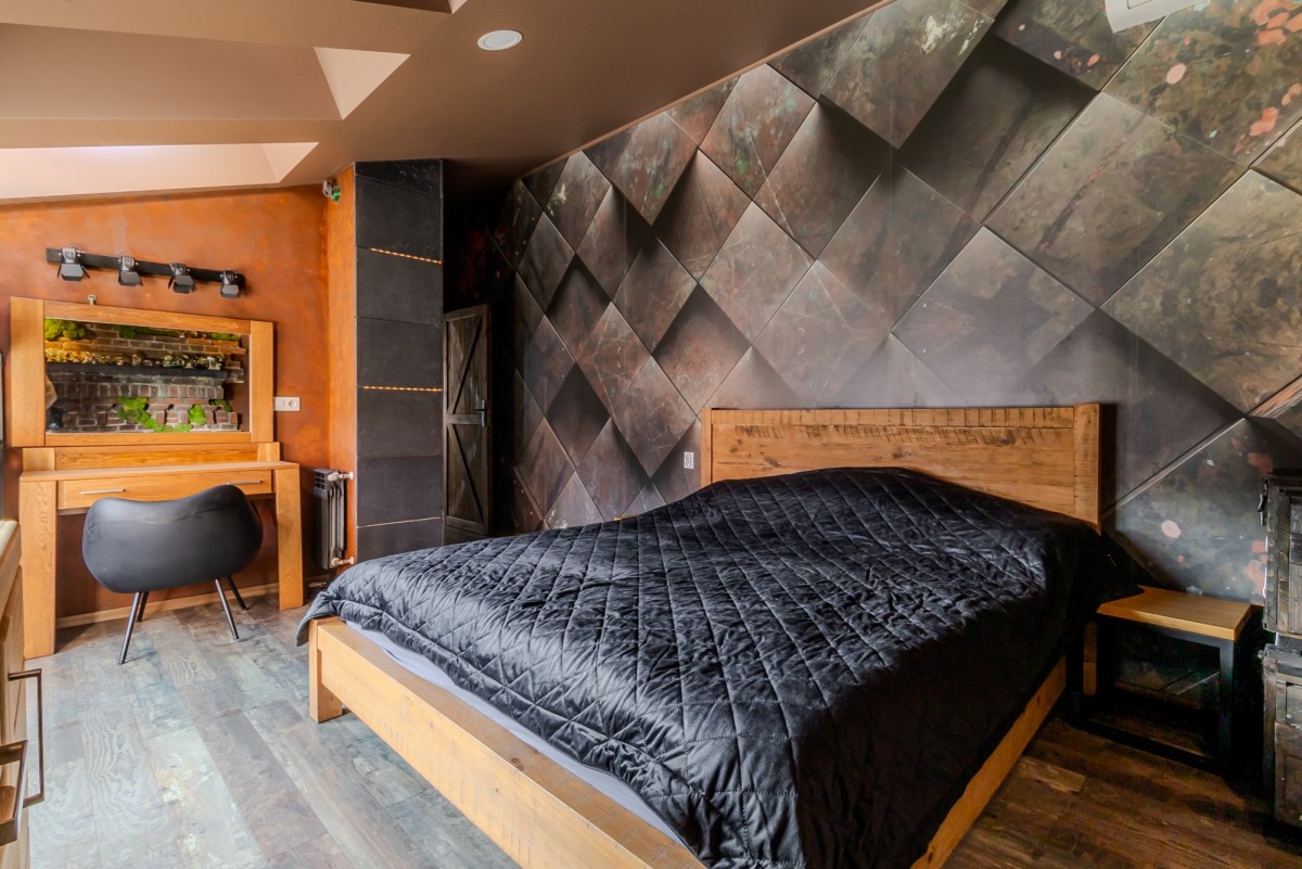 sypialnia główna z nastrojowym oświetleniem i drewnianym wykończeniem,