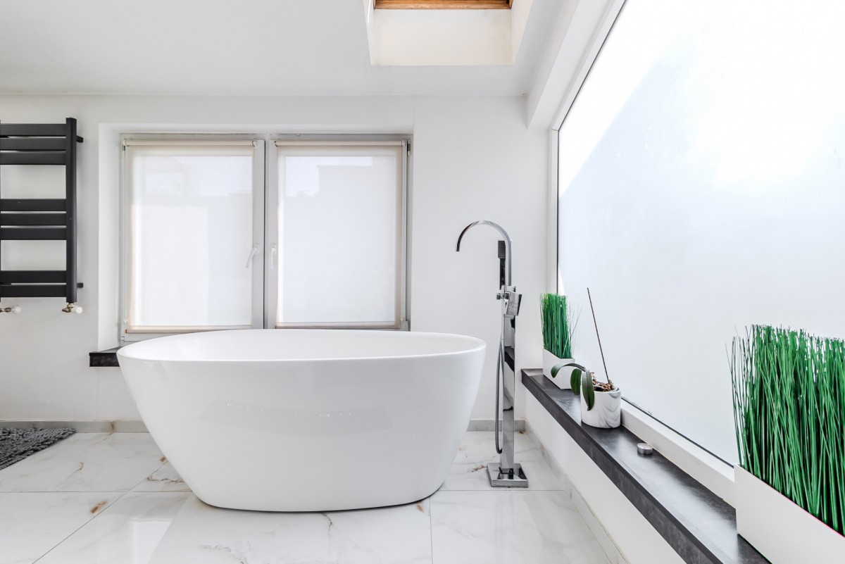 duża garderoba, łazienka z wolnostojącą wanną i świetlikiem dachowym.