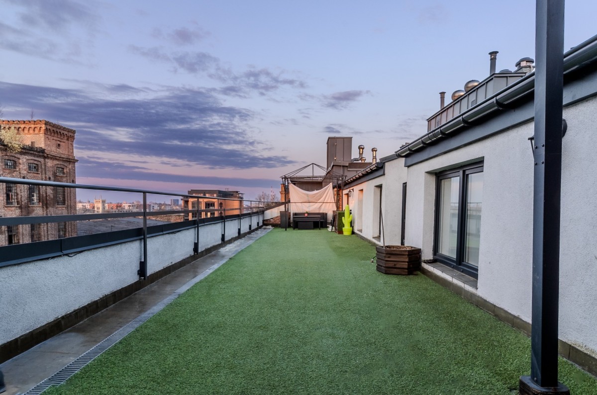 Prywatny taras o powierzchni 70 m² z panoramicznym widokiem na kompleks Scheiblera i zachody słońca nad Łodzią. To przestrzeń stworzona do odpoczynku, kameralnych spotkań i pracy w ciszy.