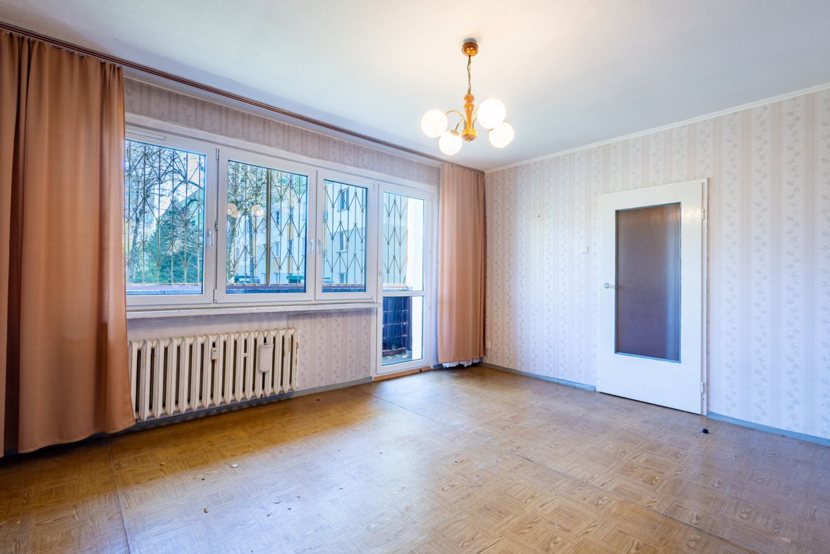 Lokal wymaga remontu, co dla wielu kupujących jest ogromnym plusem — pozwala urządzić wnętrze od podstaw, zgodnie z własnym stylem i standardem. Okna PCV są w dobrym stanie, co ogranicza zakres prac i pozwala skupić się na aranżacji. Wysoki parter to wygoda dla osób starszych, rodzin z dziećmi czy najemców, którzy nie chcą codziennie korzystać z windy. Do mieszkania przynależy komórka lokatorska w piwnicy, a wokół budynku znajduje się wiele ogólnodostępnych miejsc parkingowych.