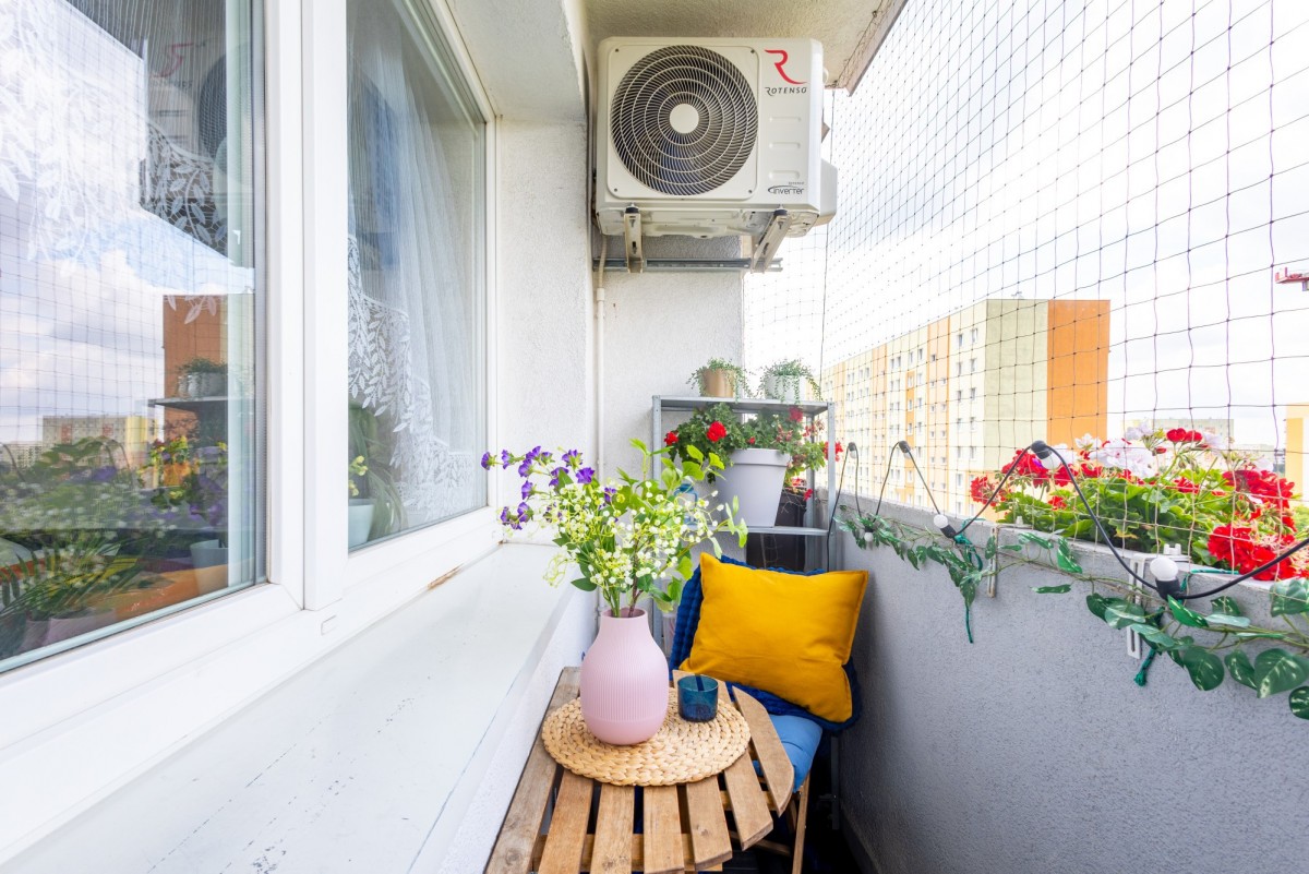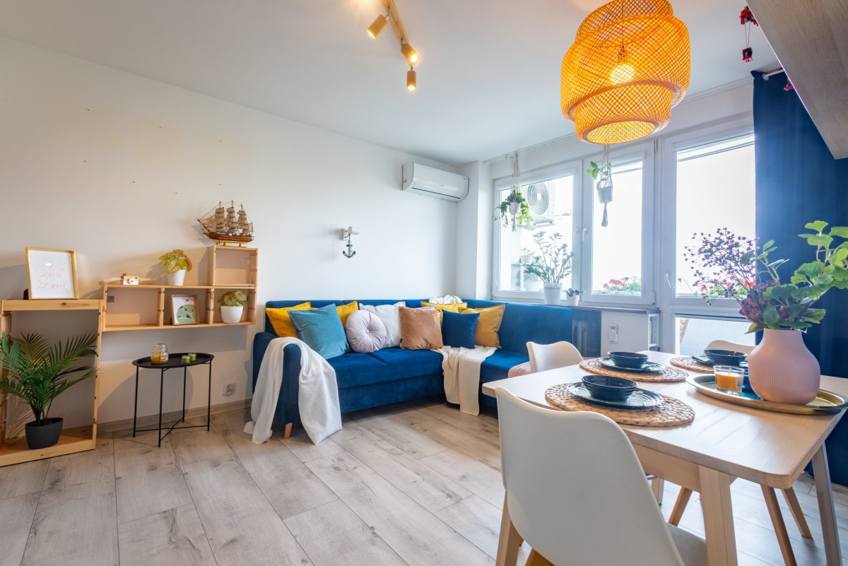 Słoneczny salon (ok. 16 m²) z wyjściem na przestronny balkon - idealny na poranną kawę czy wieczorny relaks. W salonie znajduje się nowoczesna klimatyzacja, która zapewnia przyjemną temperaturę nawet w upalne dni. W zestawie: kanapa, stylowe krzesła, funkcjonalna meblościanka.