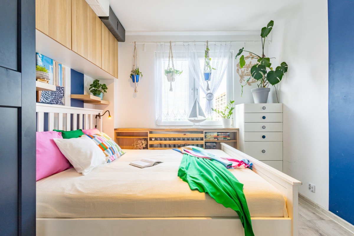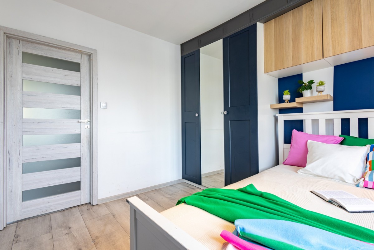 Przytulna sypialnia (15 m²) z dużą szafą i pojemną komodą - idealna do wypoczynku i przechowywania.