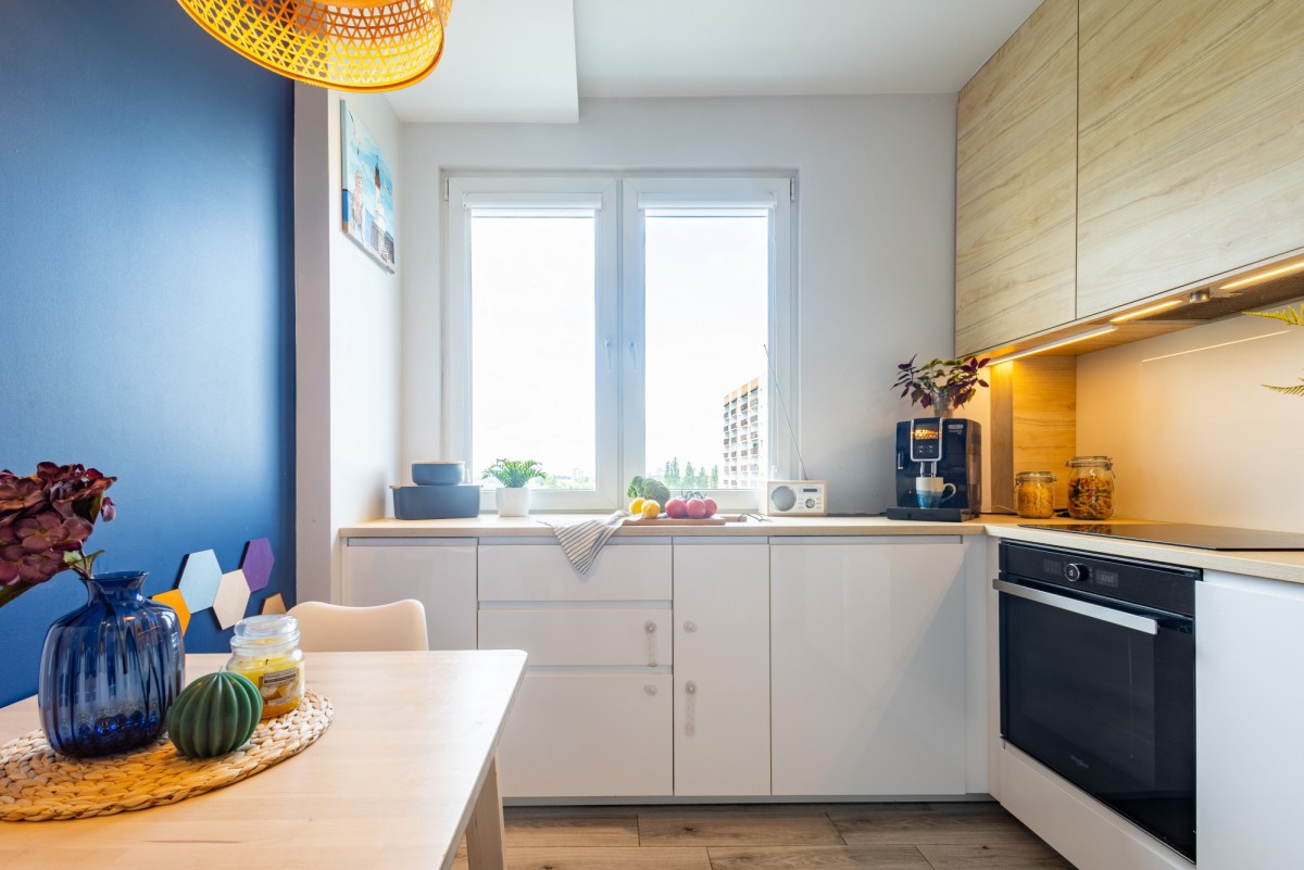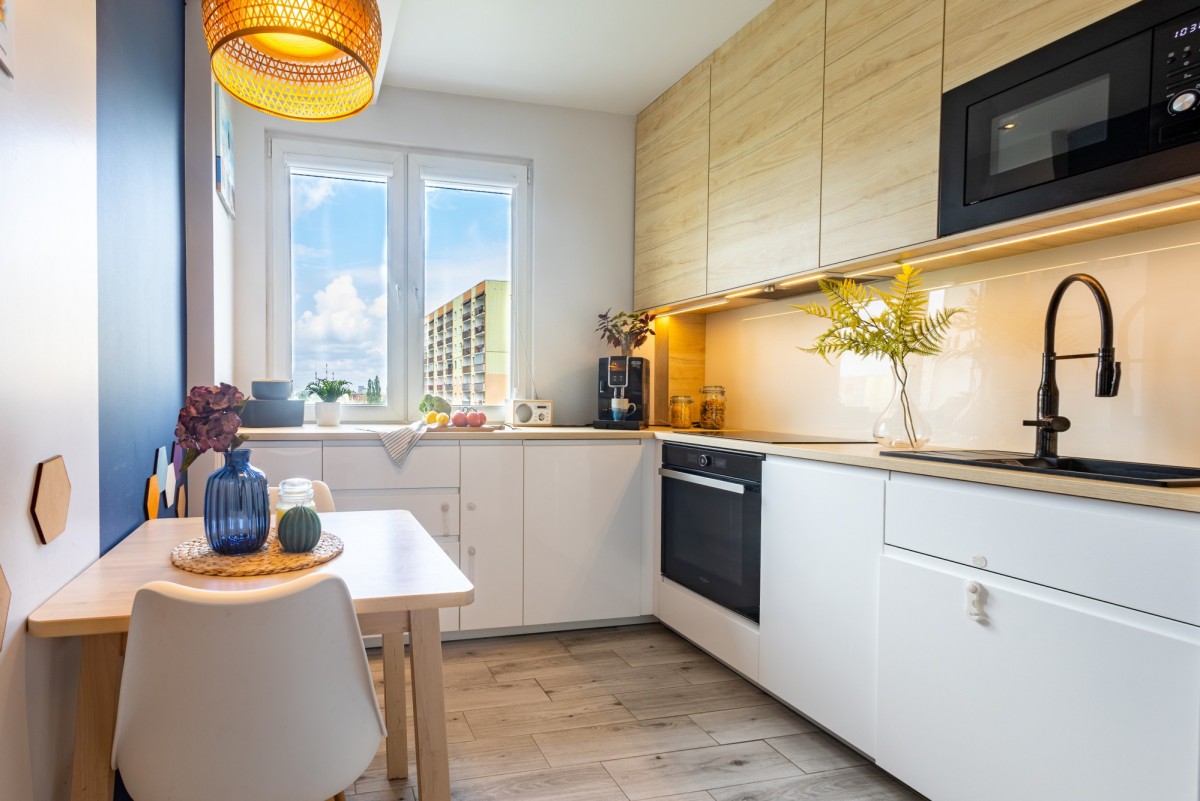 Funkcjonalna kuchnia ( 8m²) z nowoczesną zabudową i sprzętami AGD: lodówka, zmywarka, stół z krzesłami, płyta indukcyjna, mikrofala oraz piekarnik - wszystko w doskonałym stanie technicznym i wizualnym.