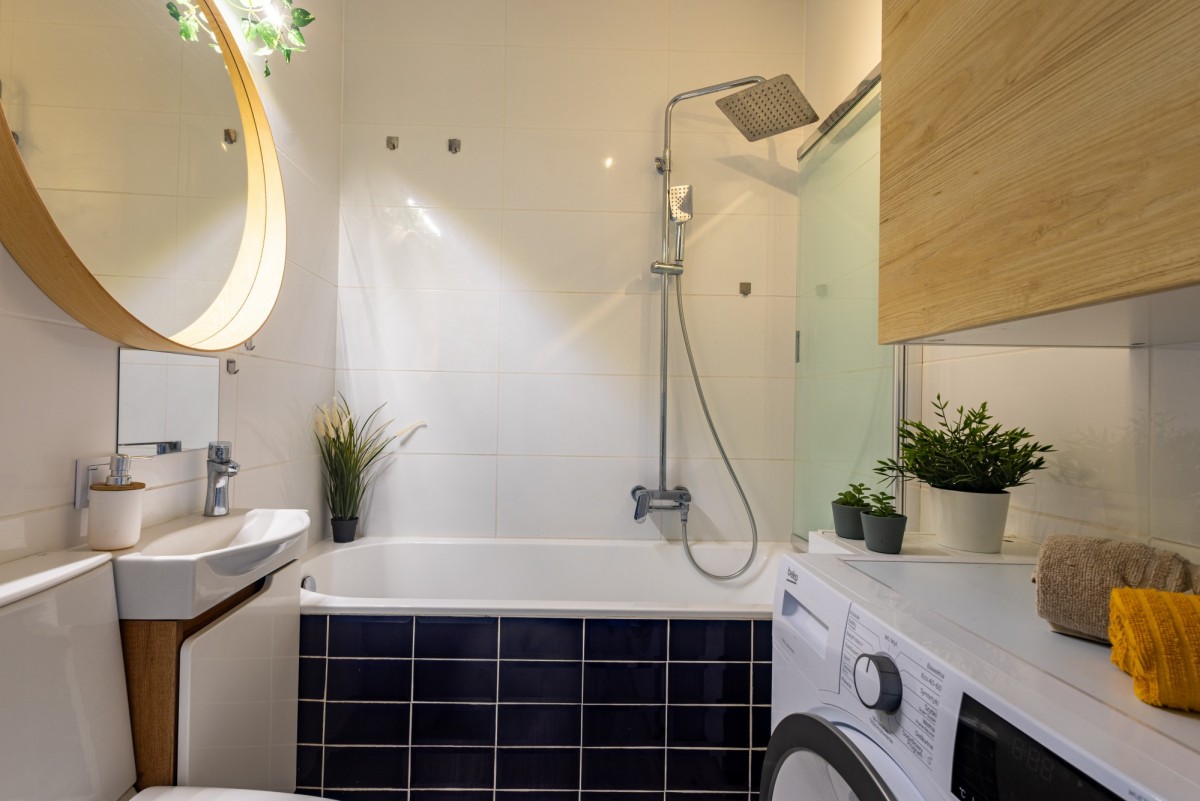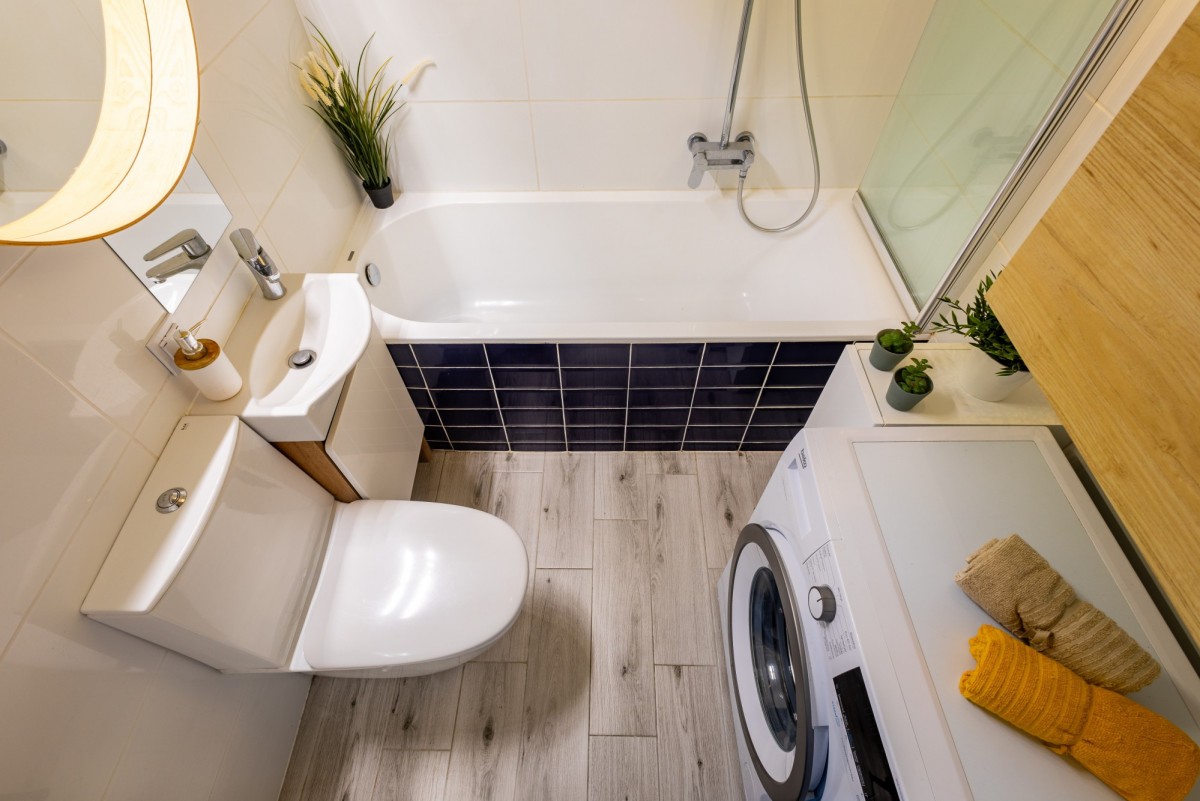 Stylowa łazienka z WC i wanną (3 m²), w której znajduje się pralka i praktyczna szafka - wszystko schludnie utrzymane.