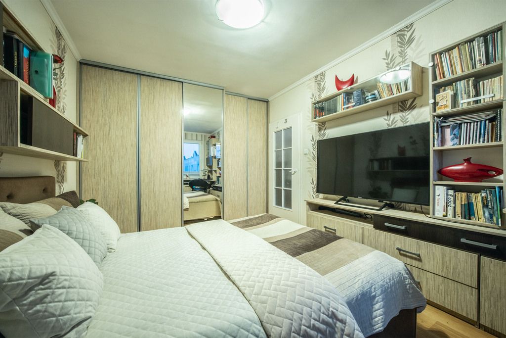 - Przestronnej sypialni z szafą, biurkiem do pracy i dużym łóżkiem, co gwarantuje znaczną swobodę,