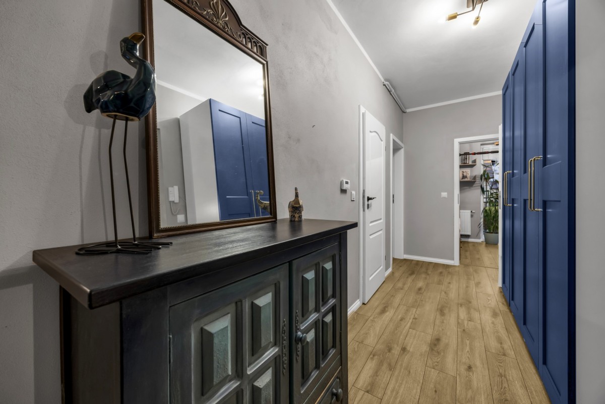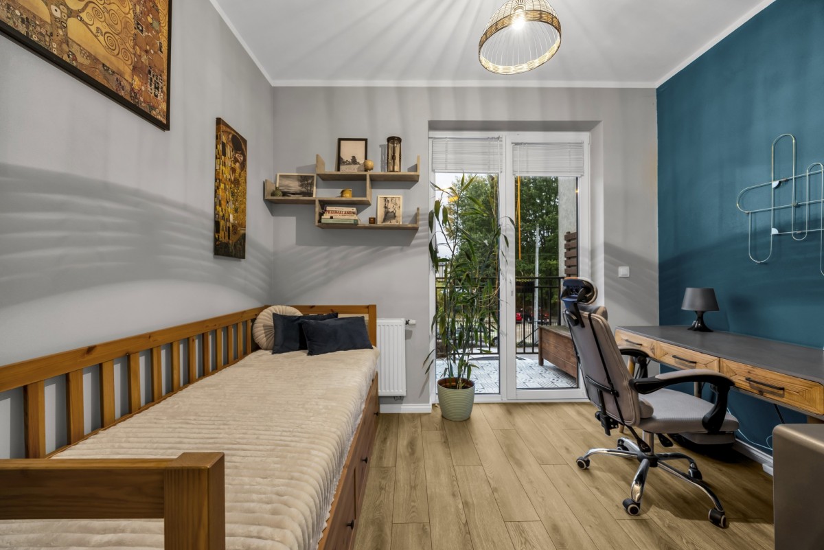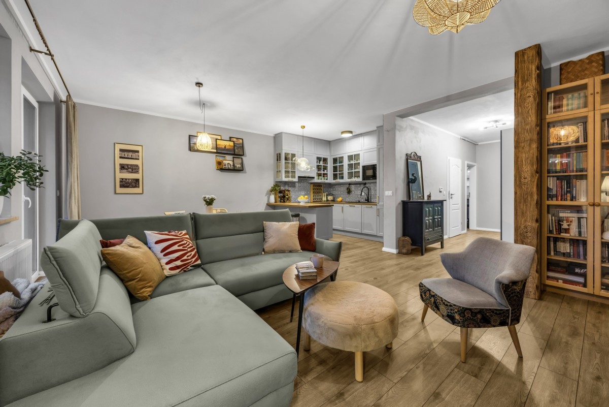 W cenie pozostają: stała zabudowa meblowa, sprzęt AGD oraz biblioteczka w salonie.