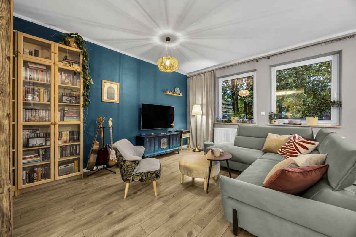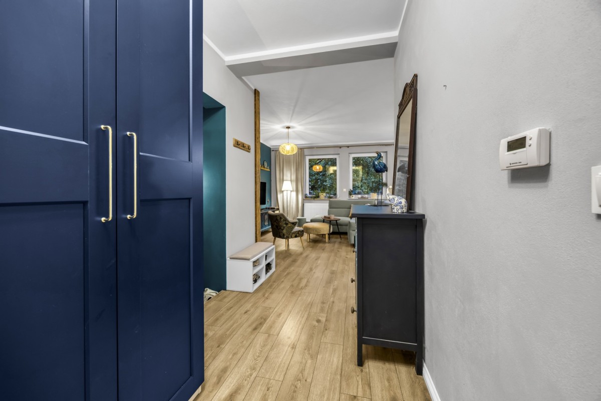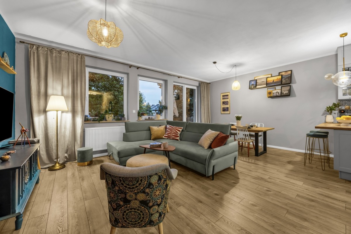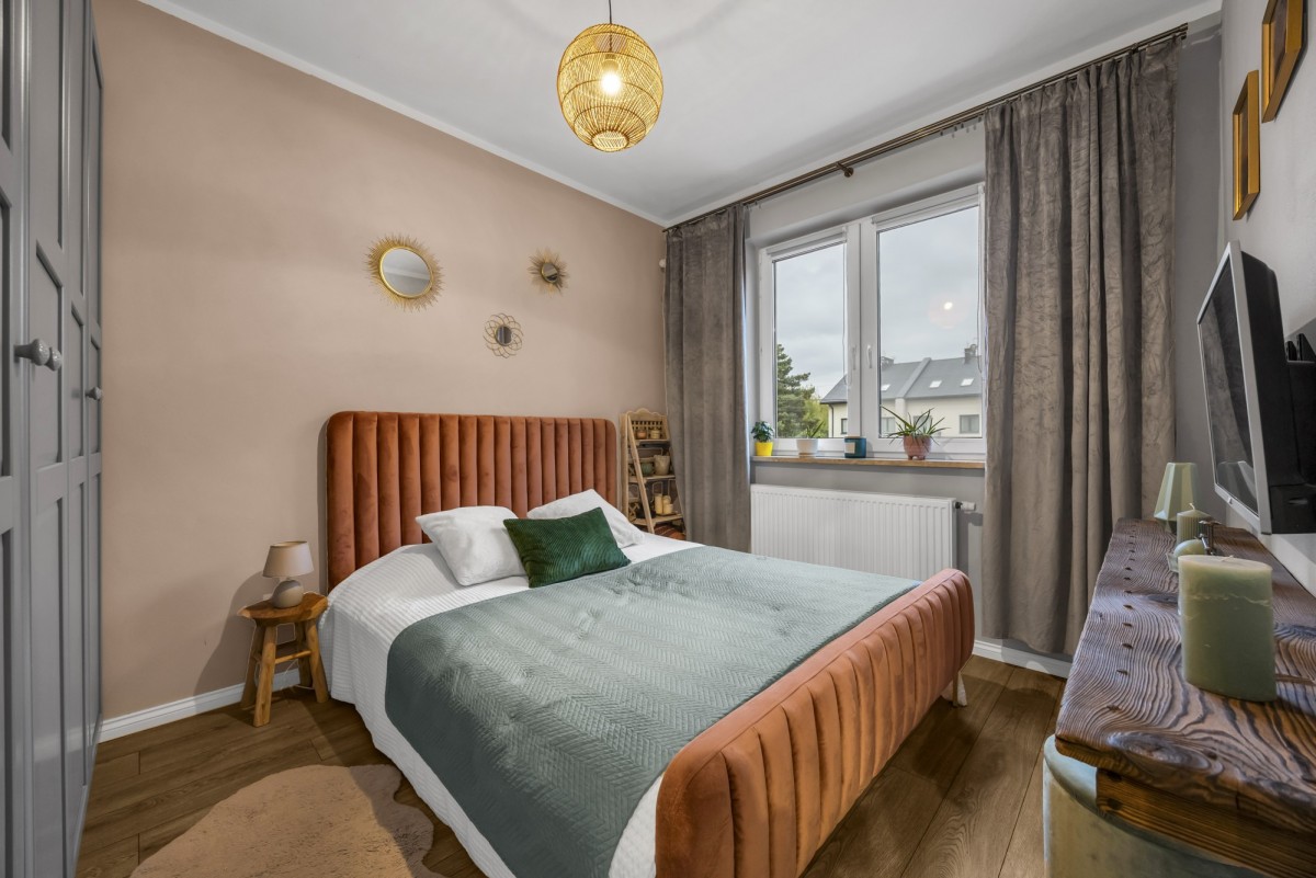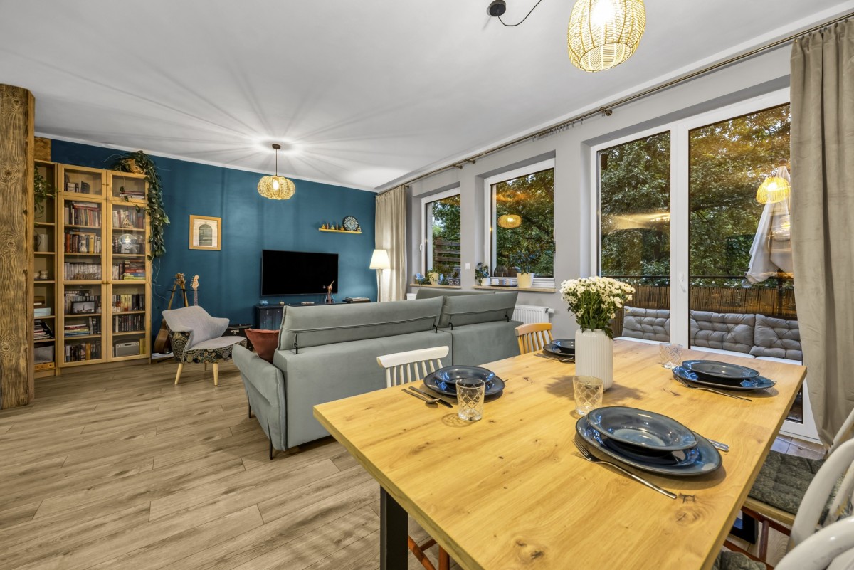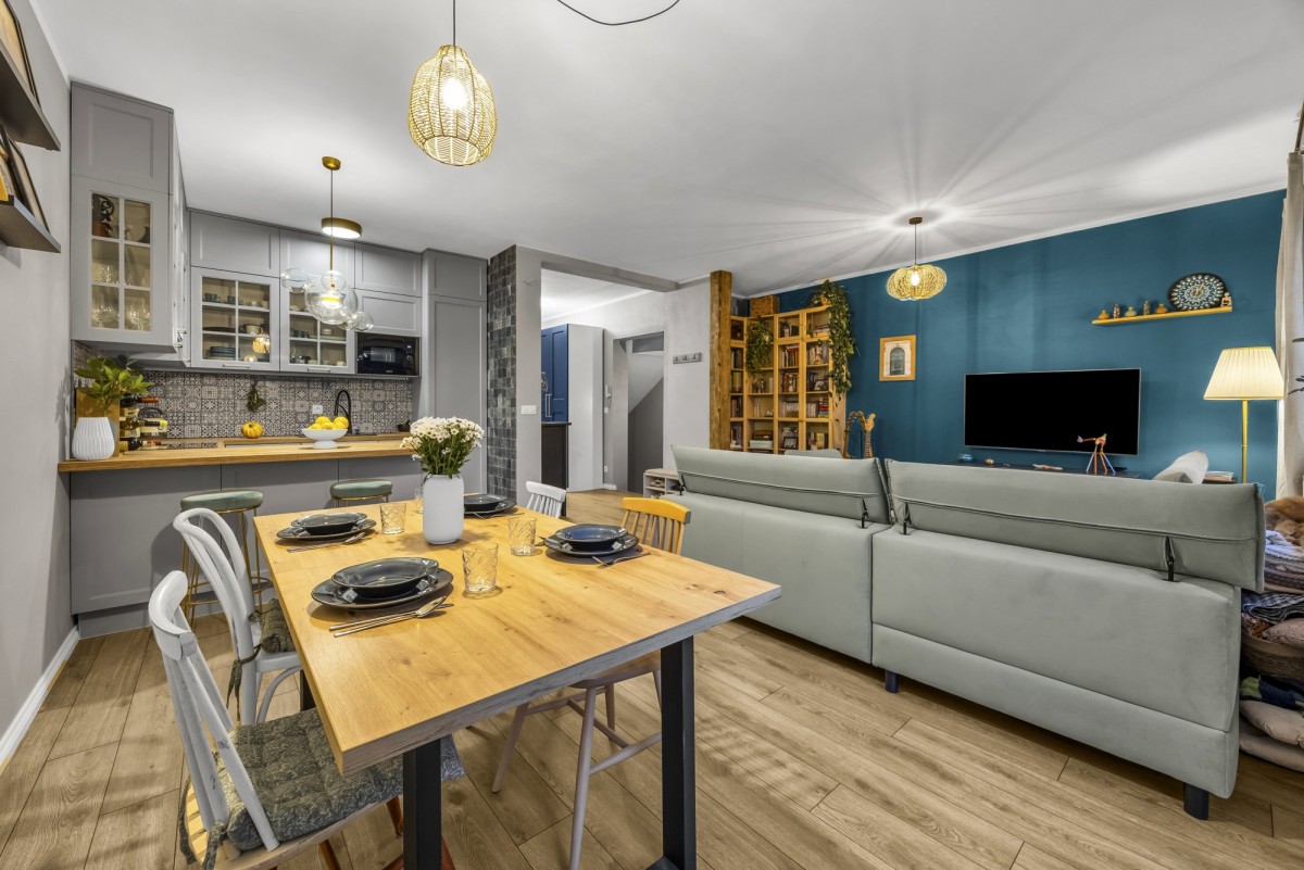 Na sprzedaż przestronne, dwupoziomowe mieszkanie bezczynszowe położone w kameralnej zabudowie segmentowej przy ul. Pastelowej w Markach.
