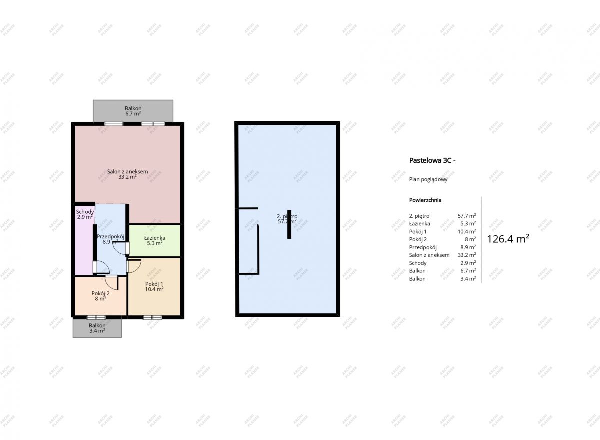 Całkowita powierzchnia mieszkania to 126 m², podzielonych na dwa poziomy: