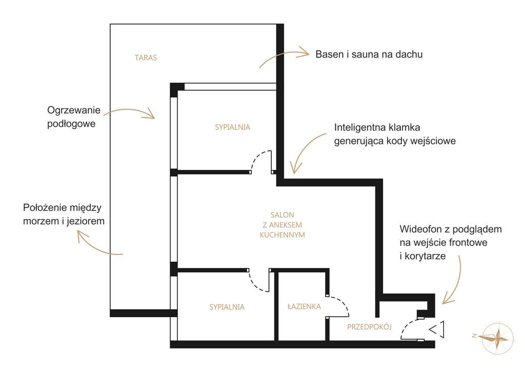 Inwestycja Sea&Lake oferuje nowoczesne rozwiązania, takie jak duże przeszklenia, schody oraz ściany na klatce wyłożone pięknymi płytami, basen typu infinity na dachu, nowoczesna winda, drzwi wyposażone w klamki generujące kody do wejścia, monitoring, recepcja, ochrona Mieszkanie wykończone w wysokim standardzie z ogrzewaniem podłogowym, klimatyzacją, markowymi sprzętami AGD oraz system inteligentnego zarządzania apartamentem.