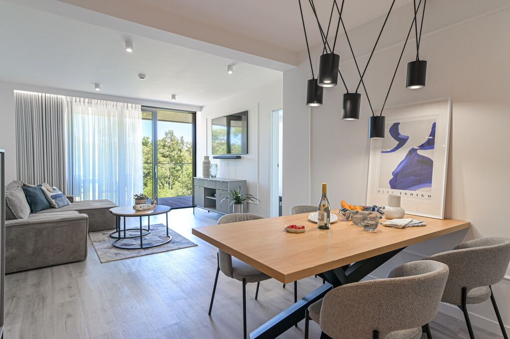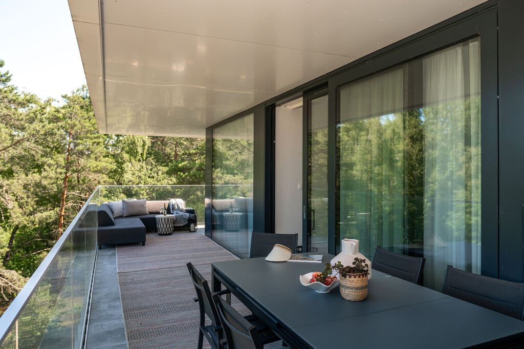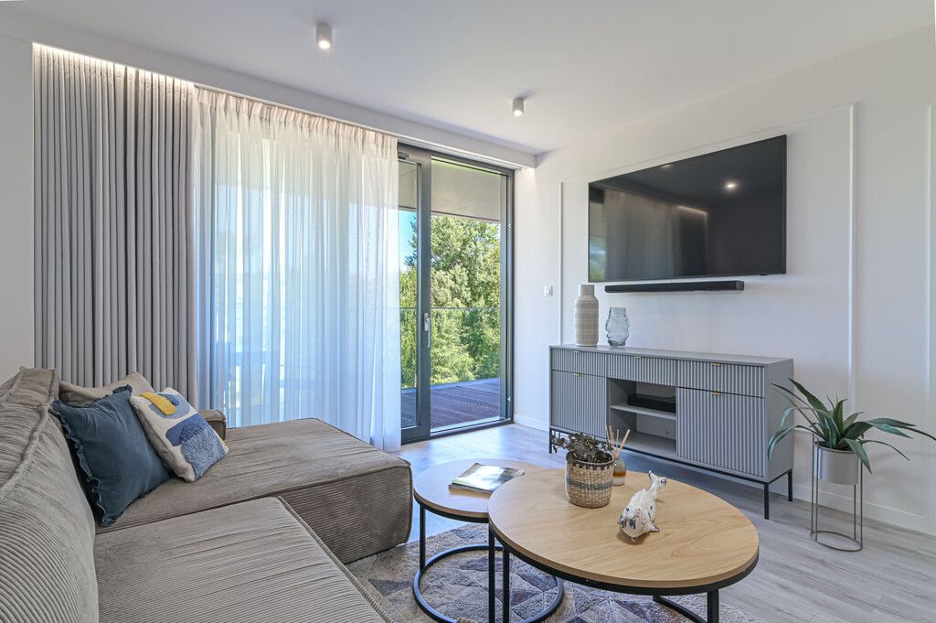 Apartament składa się z dwóch sypialni, przestronnego salonu z aneksem kuchennym oraz łazienki. Duży, narożny balkon o powierzchni 34 m² z widokiem na sosnowy las pozwala na relaks na świeżym powietrzu i daje możliwość instalacji jacuzzi. Mieszkanie znajduje się na 3. (ostatnim) piętrze dzięki czemu nie słyszymy hałasów z góry i napawamy się pięknym widokiem.