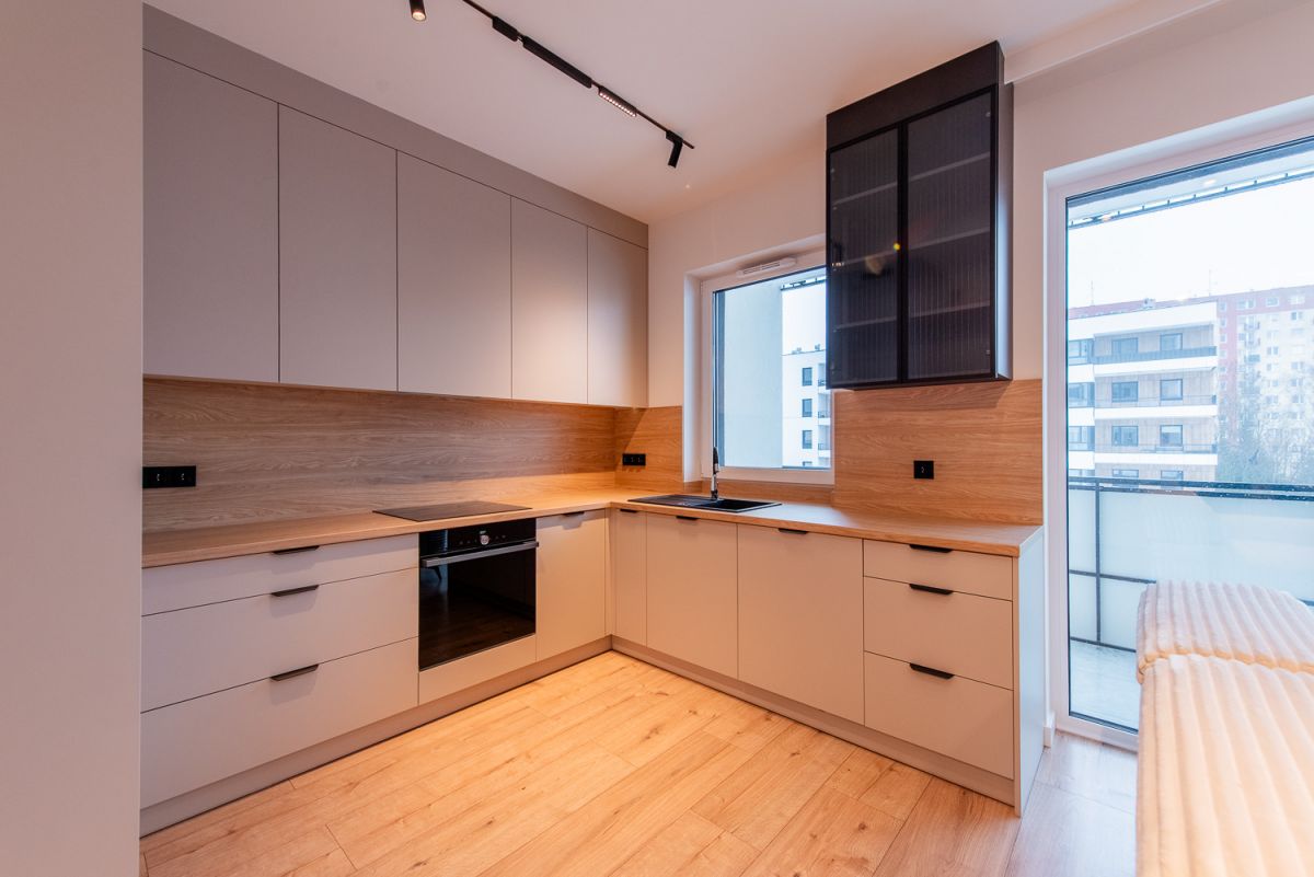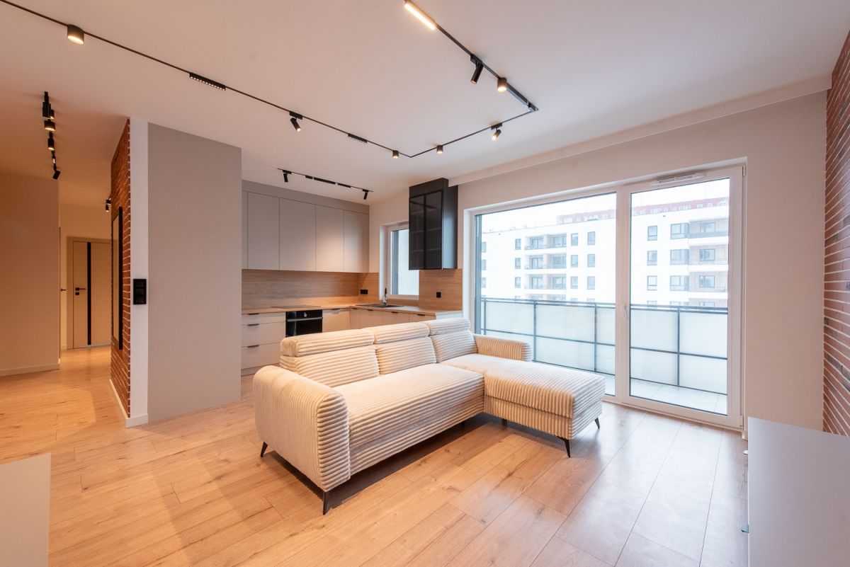 przestronny salon z aneksem kuchennym z dużymi, nowoczesnymi oknami zapewniającymi doskonałe doświetlenie wnętrza,