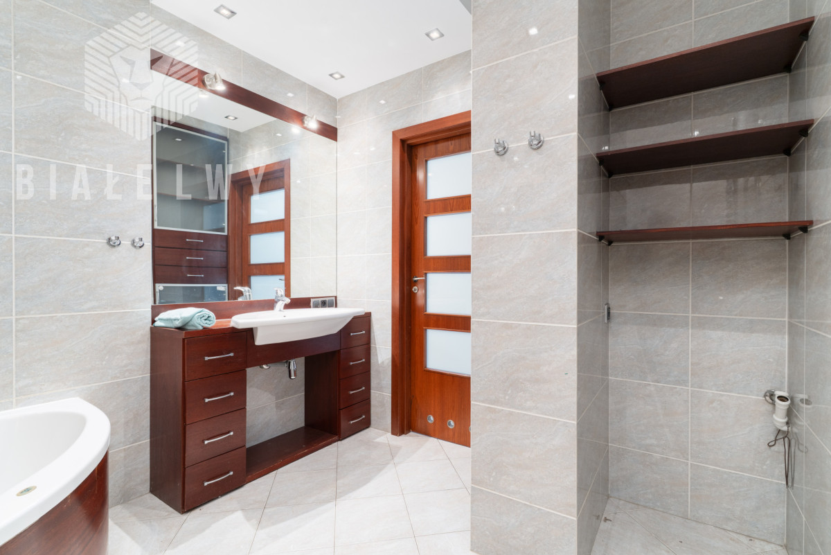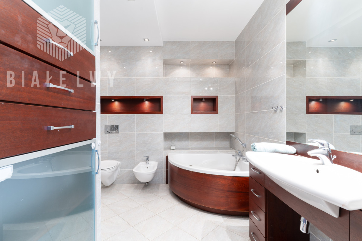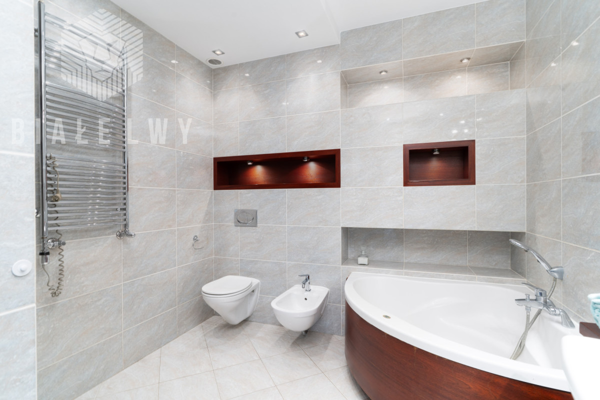 - z pokoju kąpielowego z przestronną z wanną, umywalką, miską klozetową, bidetem i miejscem na pralkę i suszarkę