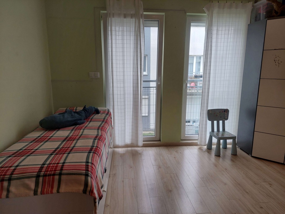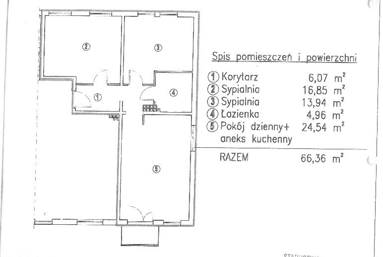 Rozkład pomieszczeń przedstawia się następująco: spory pokój dzienny wraz z aneksem kuchennym o powierzchni 24,5 mkw z wyjściem na niewielki balkon, dwie sypialnie o pow. ok. 17 mkw i 14 mkw, wygodna łazienka o pow. 5 mkw i przestronny korytarz o pow. 6 mkw.