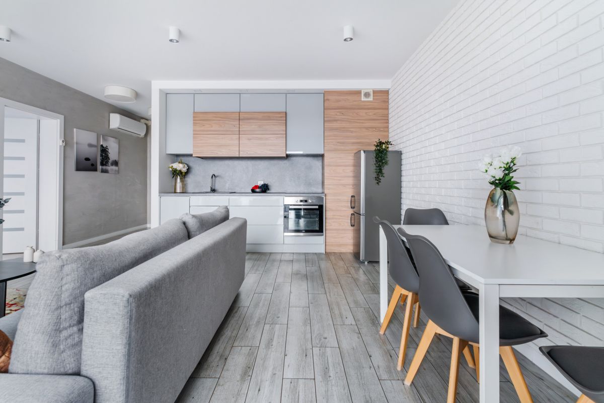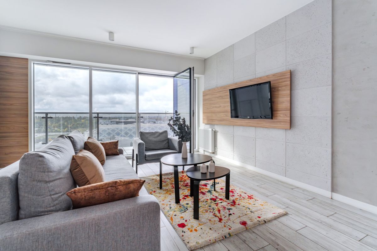 • Salon z aneksem kuchennym i wyjściem na balkon,