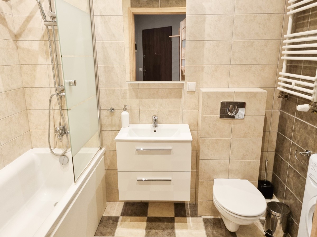 - w łazience, w kuchni i na korytarzu są ładne płytki podłogowe,