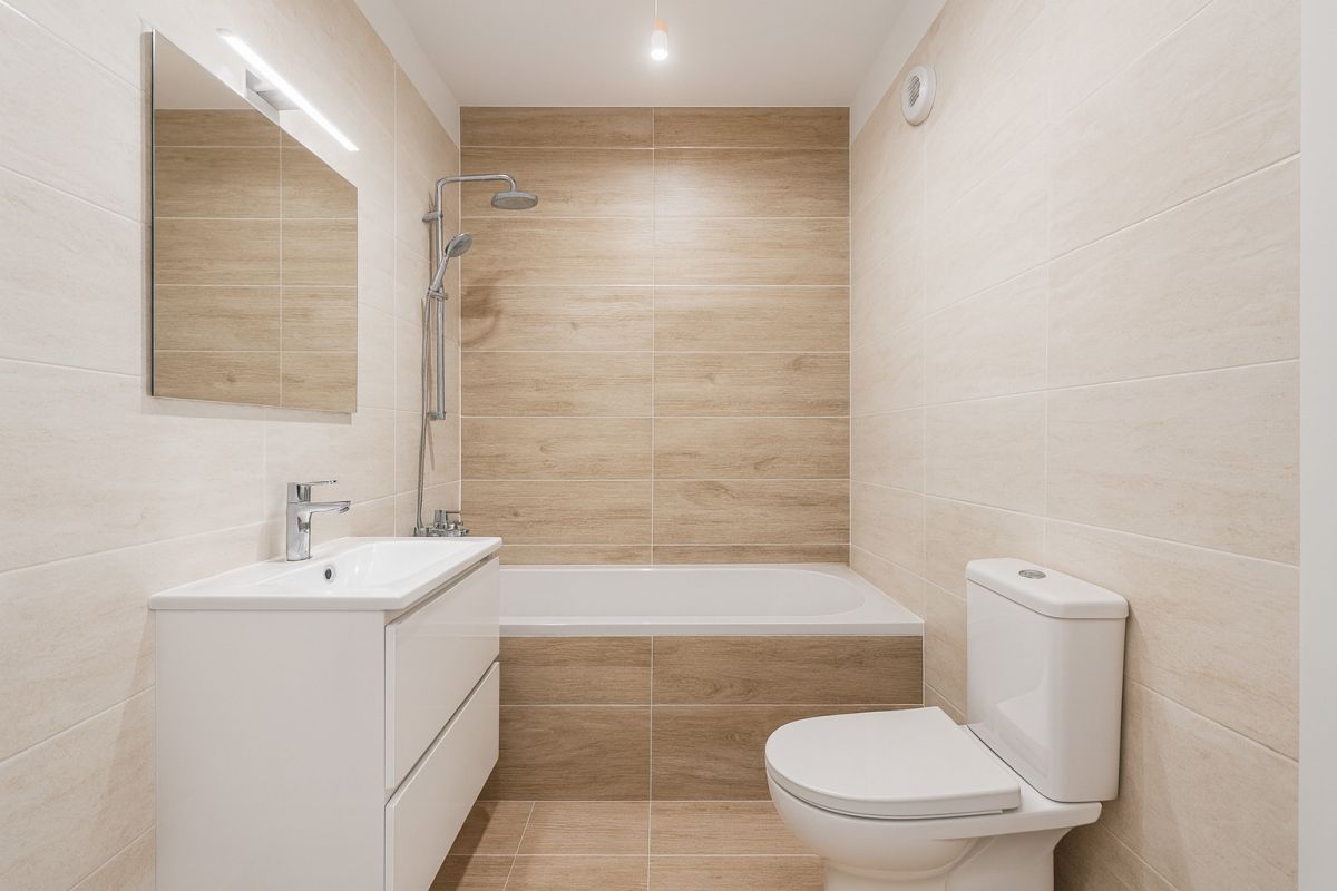Przemyślany układ instalacji pozwala na stworzenie nowoczesnej strefy kąpielowej z wanną lub prysznicem typu walk-in, zabudowaną toaletą i funkcjonalną szafką umywalkową.