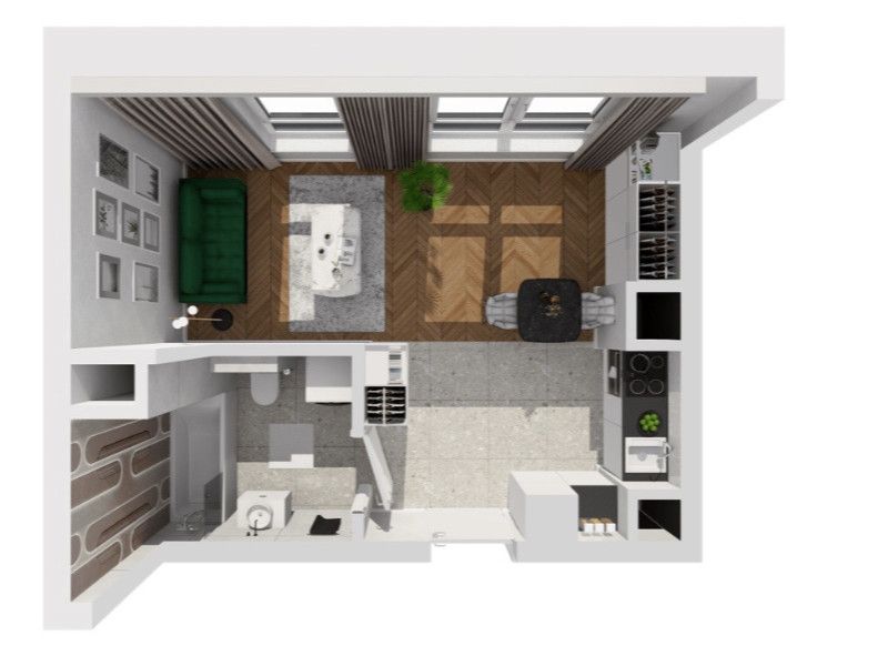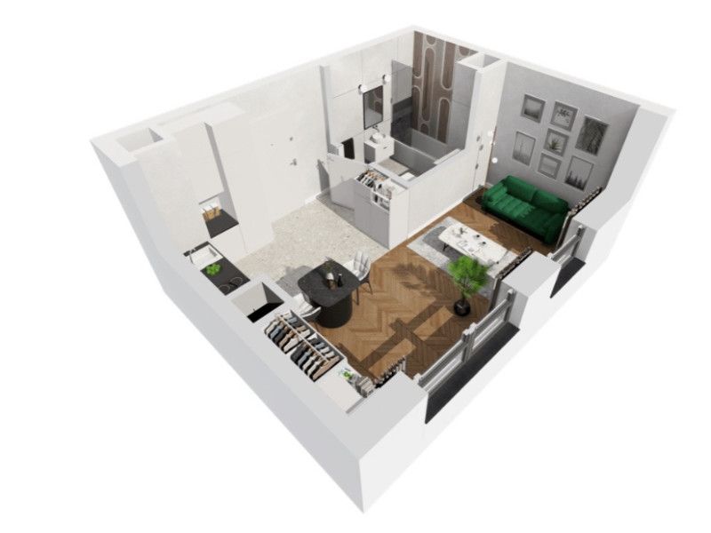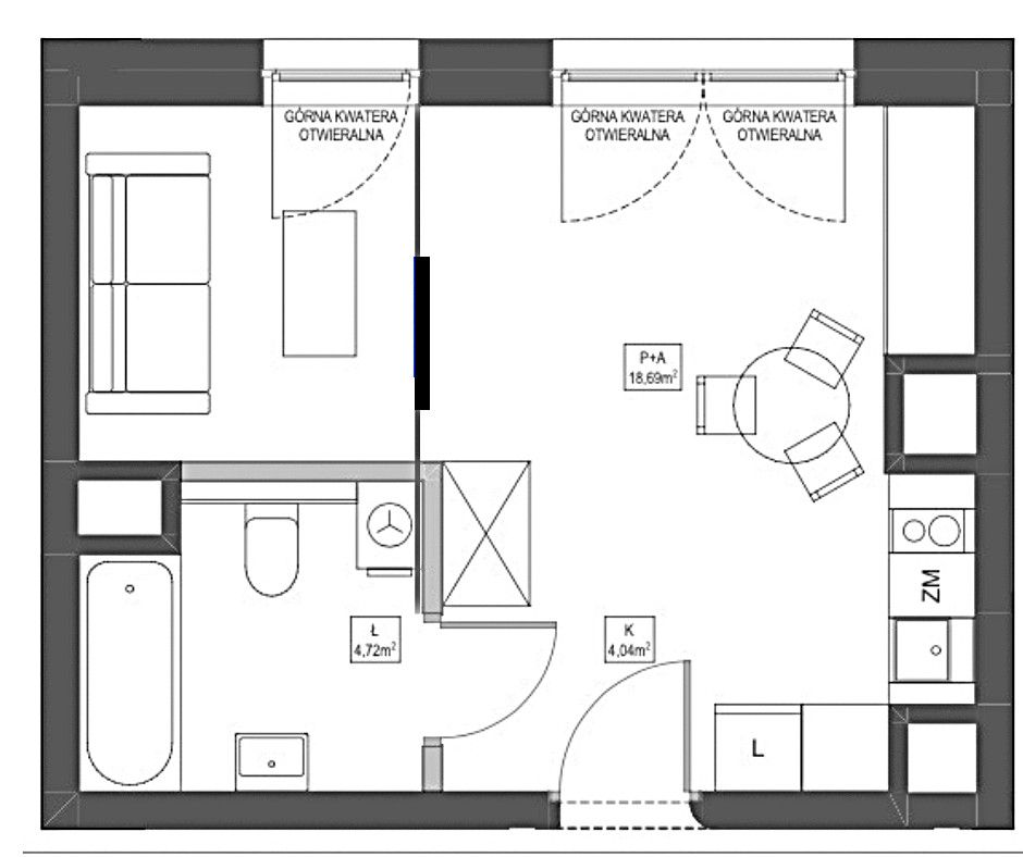Przestronny, jasny pokój dzienny z dużymi oknami, który można zaaranżować jako salon z aneksem kuchennym lub - dzięki układowi pomieszczenia - wydzielić osobną, w pełni doświetloną sypialnię bądź gabinet do pracy zdalnej.