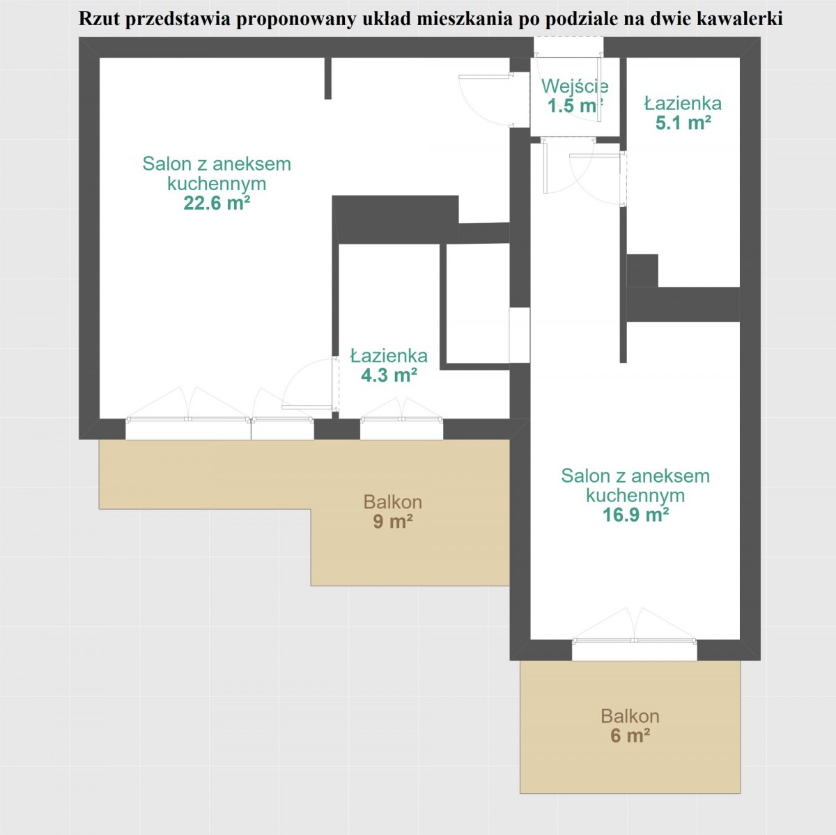 Mieszkanie składa się z dwóch kawalerek połączonych korytarzem o pow. ok. 1,8 m2.