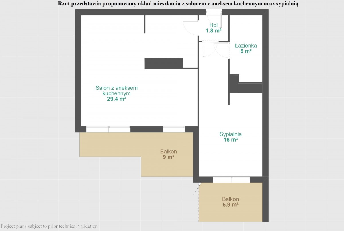 • salonu z aneksem kuchennym z wyjściem na balkon - 16,9 m2;