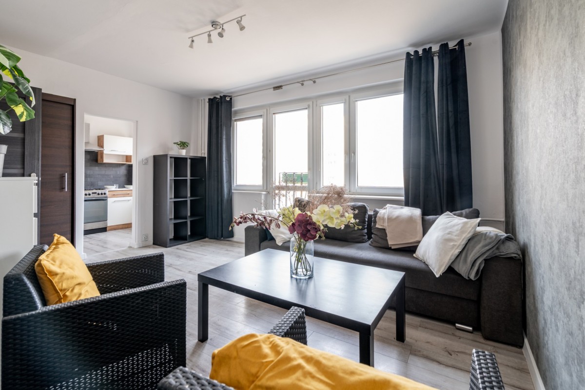 Układ mieszkania: duży pokój, kuchnia z oknem, łazienka z toaletą